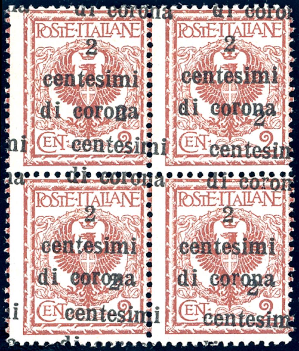 TRENTO E TRIESTE 1919 - 2 cent. su 2 cent., doppia soprastampa di cui una fortemente spostata in alto e a destra (2ba), blocco di quattro, ... Read more
