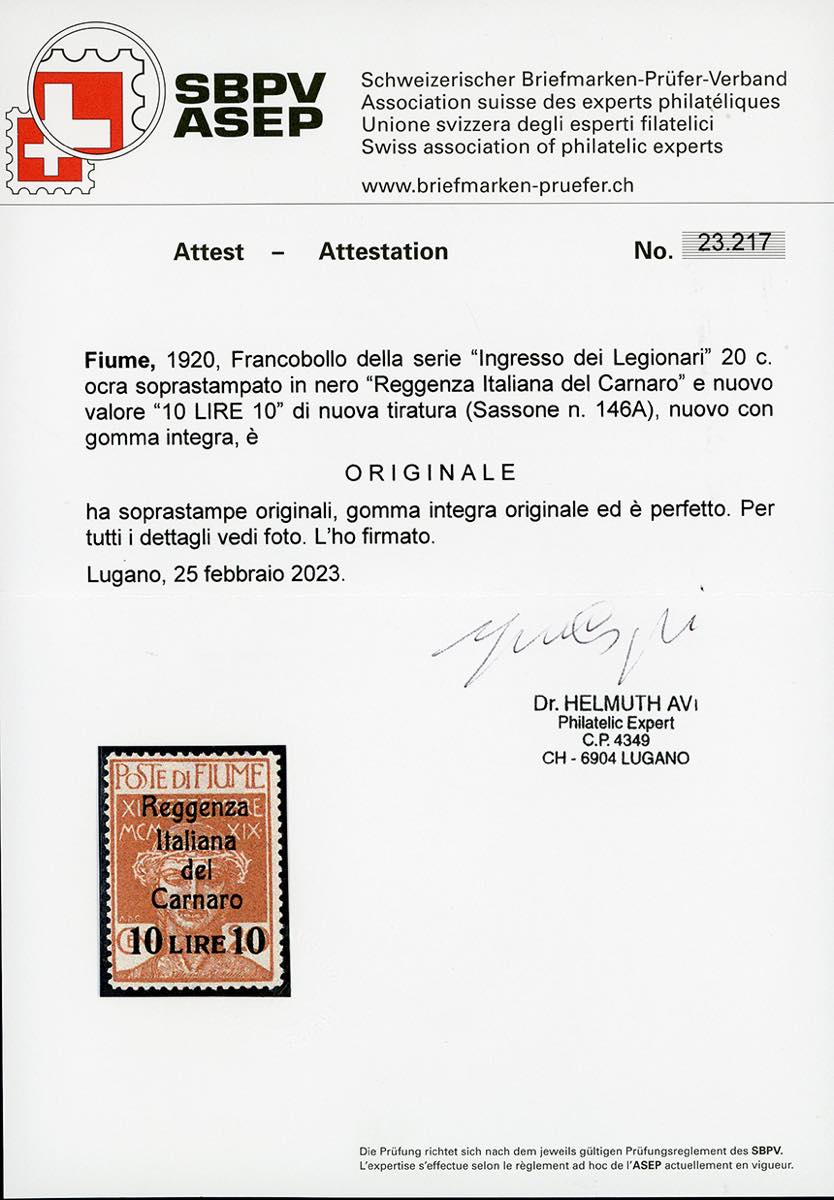 FIUME 1920 - 10 lire su 20 cent. Reggenza Italiana del Carnaro, nuova tiratura (146A), gomma originale integra, perfetto e di ottima ... Read more