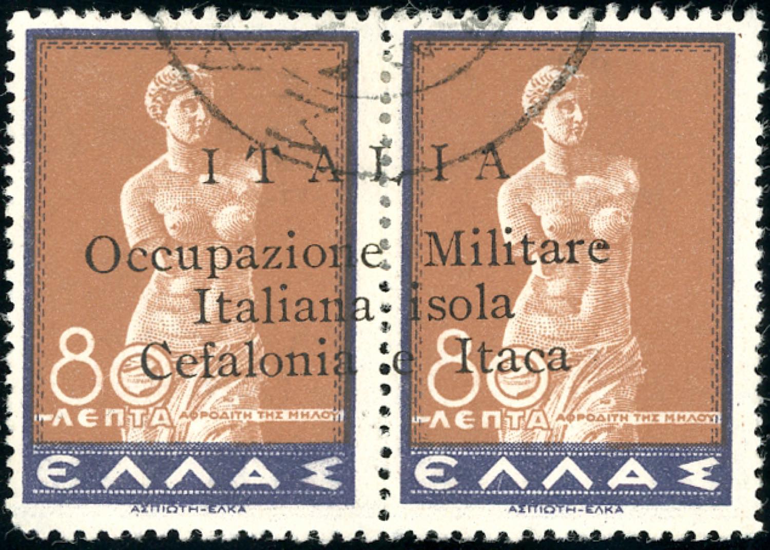 EMISSIONI DI ARGOSTOLI 1941 - 80 l. + 80 l. Mitologica, varietà "ISOLA" al posto di "ISOLE" (16r), usato, perfetto. Rarissimo. Raybaudi, A.Diena, G.Oliva, cert. Ferrario.