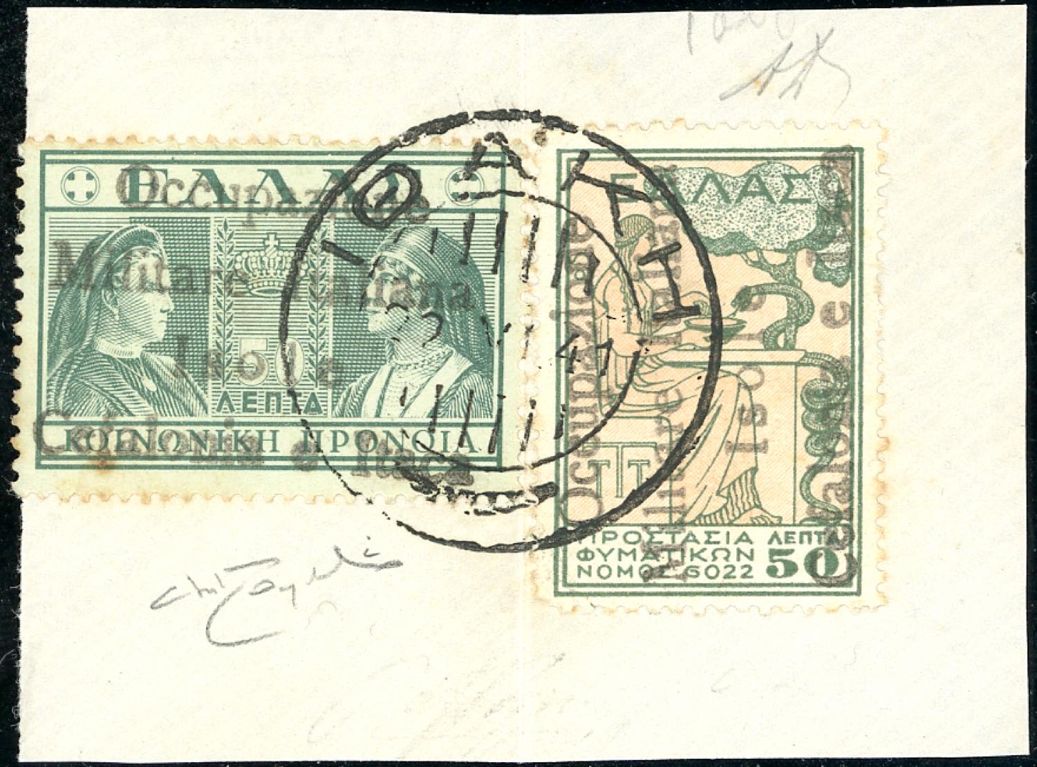 EMISSIONI DI ITACA 1941 - 50 l. verde e bistro Beneficenza, 50 l. Previdenza Sociale (48,44), perfetti, usati su frammento. Molto raro. A.Diena, cert. Oro Raybaudi.