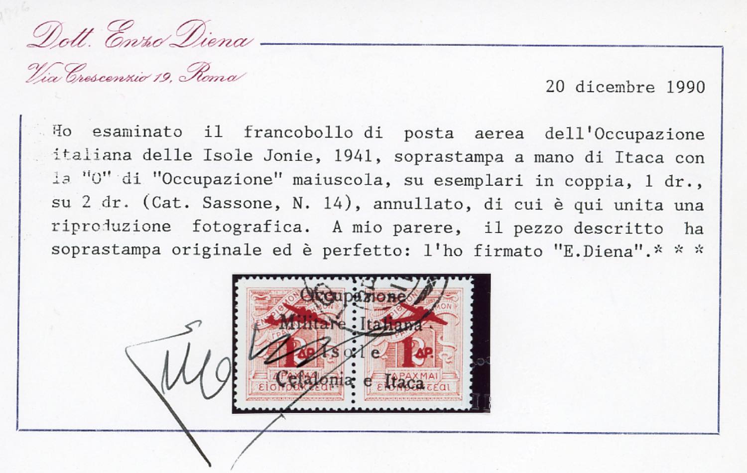 EMISSIONI DI ITACA POSTA AEREA 1941 - 1 su 2 + 1 su 2 d. (14), usato, perfetto. Splendido e molto raro. Fiecchi, cert. E.Diena, Ferrario.