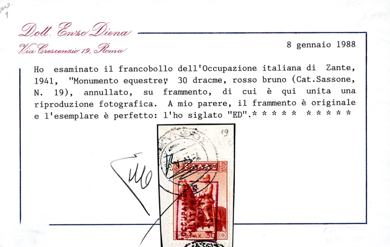 ZANTE 1941 - 30 d. soprastampato (19), perfetto, usato su frammento. Raro. Cert. E.Diena.