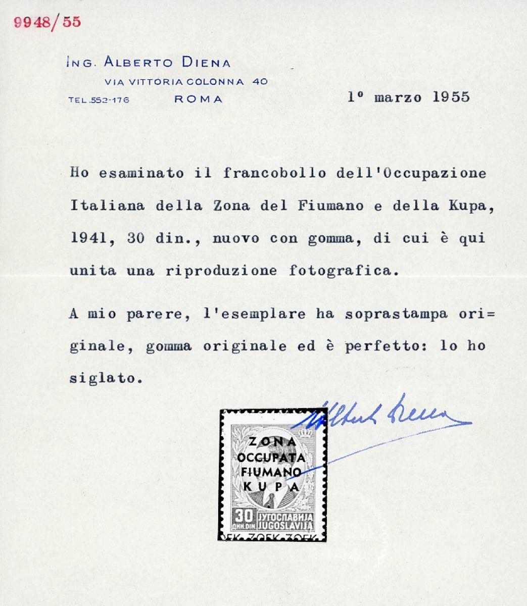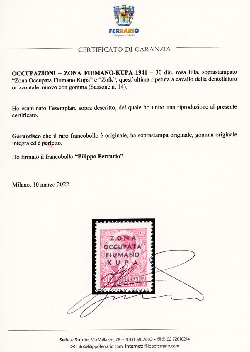 ZONA FIUMANO KUPA 1941 - 30 din. soprastampato (14), gomma originale integra, perfetto. Bello e raro! Bottacchi, cert. E.Diena e Ferrario.
