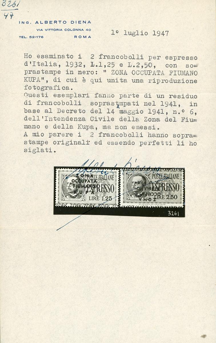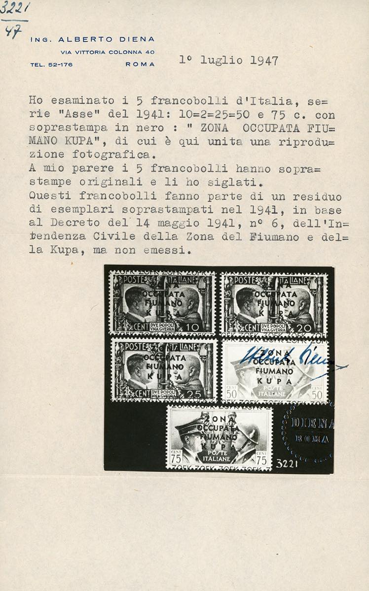 ZONA FIUMANO 1941 - Non emessi, serie completa di 7 valori (25/31), gomma originale integra, perfetti. Splendidi e molto rari. Due cert. storici A.Diena del 1947.