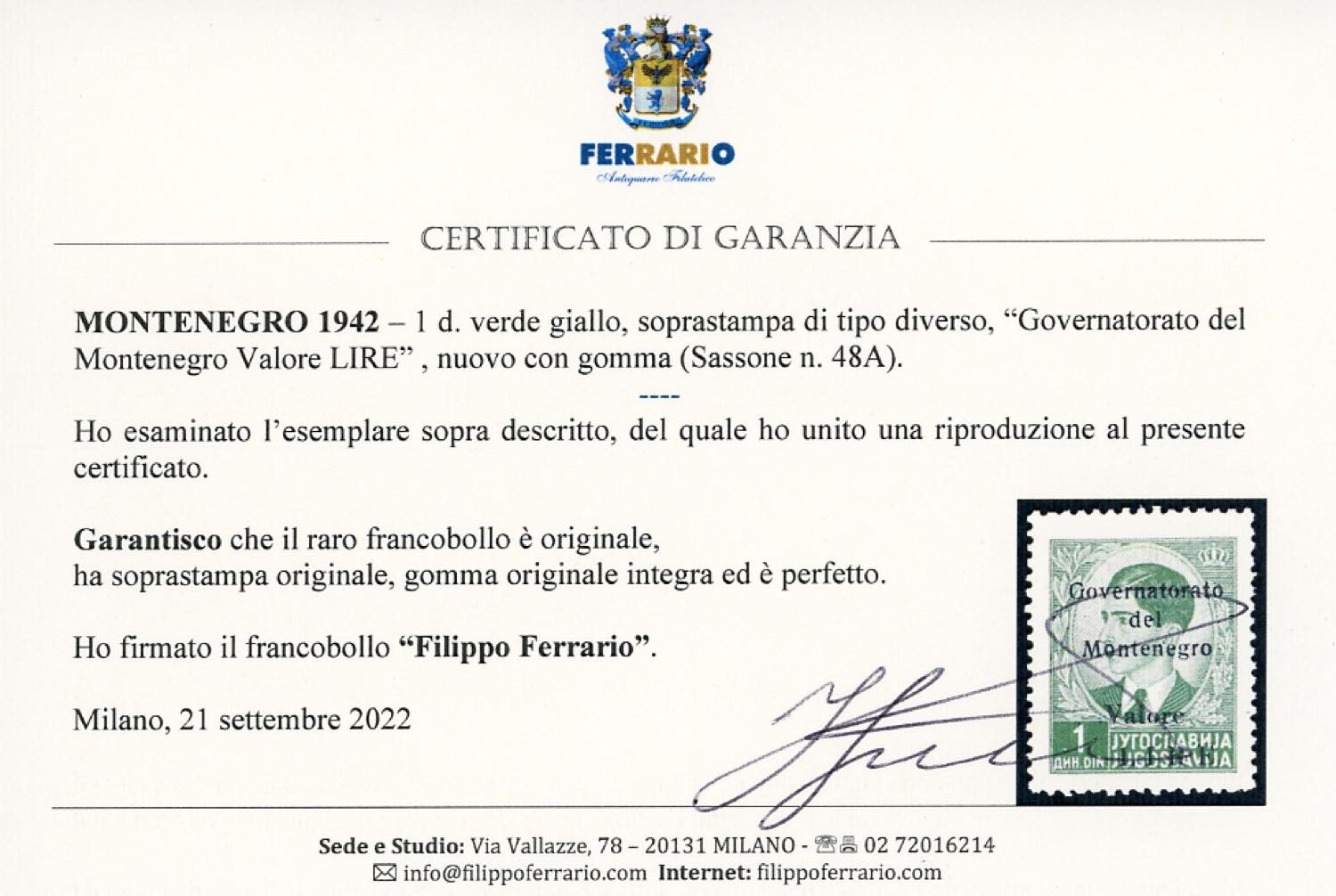 MONTENEGRO 1942 - 1 d., soprastampa di tipo diverso (48A), gomma originale integra, perfetto. Molto raro e di ottima qualità. Mondolfo, cert. Diena e Ferrario.