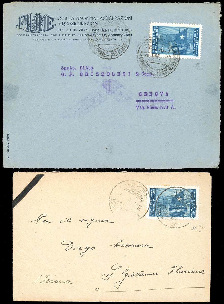 ISTRIA E LITORALE SLOVENO 1946 - 4 lire, tiratura di Lubiana (46), due esemplari, perfetti, su altrettante buste, una da Fiume 30/1/1946 a S.Giovanni Ilarione, l'altra da Fiume 26/1/1946 a Genova. Ferrario.