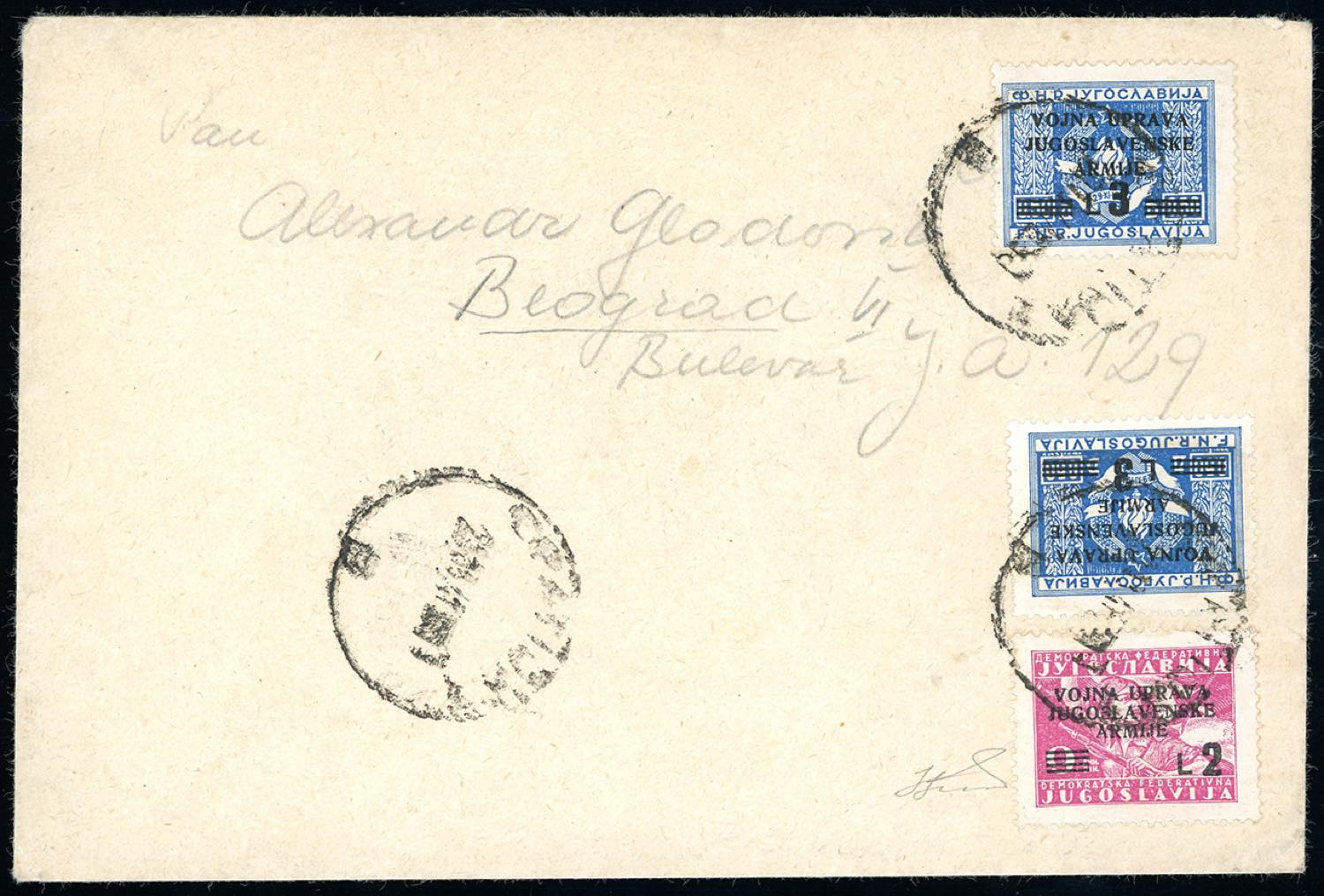 LITORALE SLOVENO AMMINISTRAZIONE MILITARE JUGOSLAVA 1947 - 2lire su 9 d., 3 lire su 0,50 d., due esemplari (69,70), perfetti, su busta da ... Read more