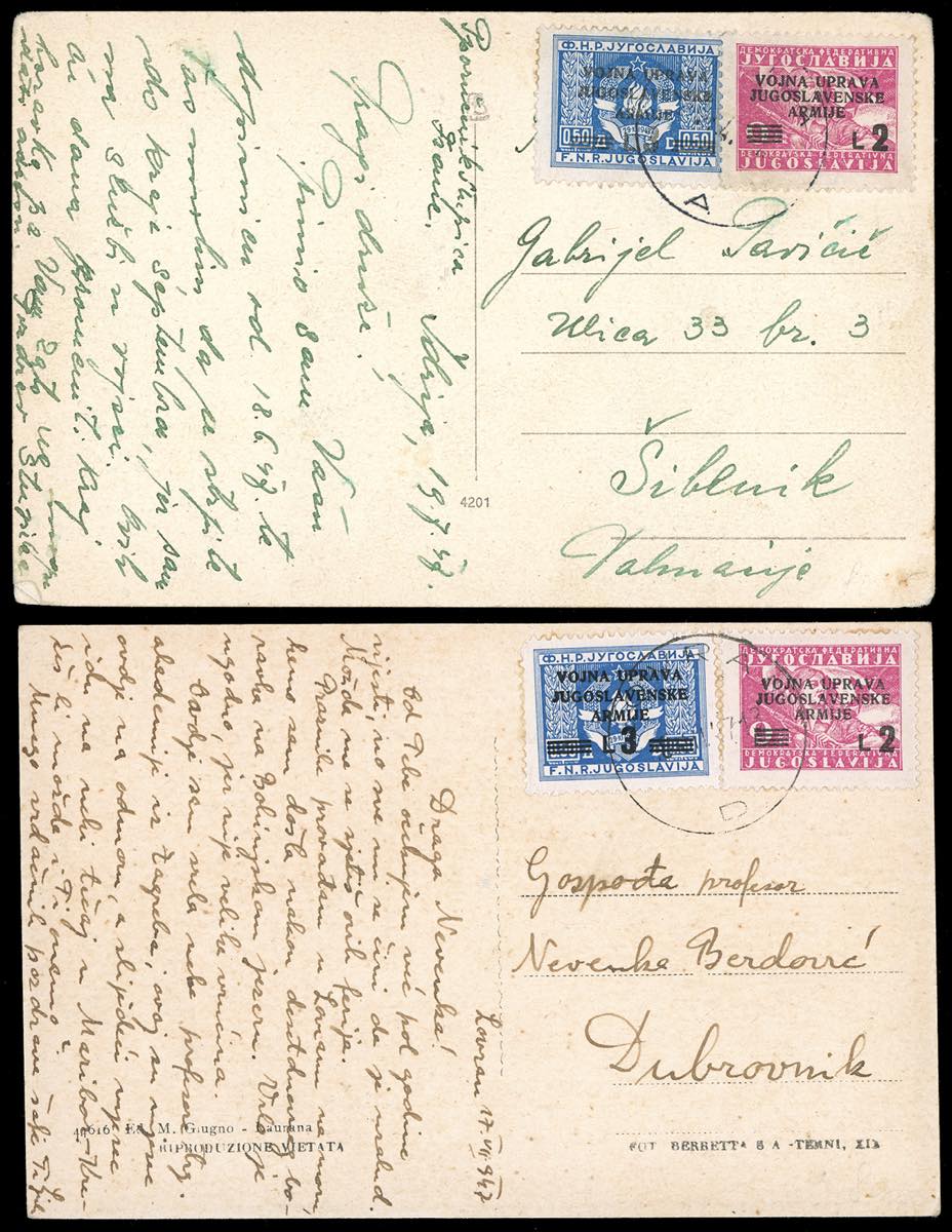 LITORALE SLOVENO AMMINISTRAZIONE MILITARE JUGOSLAVA 1947 - Due cartoline affrancate con 2 lire su 9 d. e 3 lire su 0,50 d. (69/70), un ... Read more