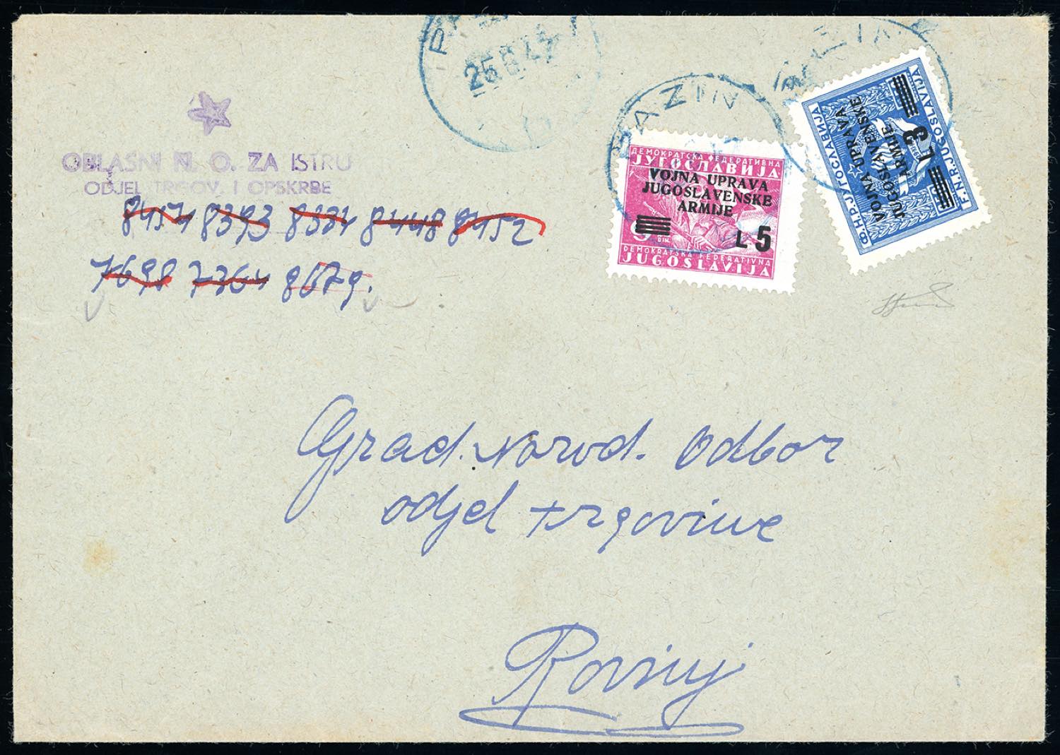 LITORALE SLOVENO AMMINISTRAZIONE MILITARE JUGOSLAVA 1947 - 3 lire su 50 d., 5 lire su 9 d. (70,71), perfetti, su busta da Pisino 25/6/1947 a Rovigno. Non comune. Ferrario.
