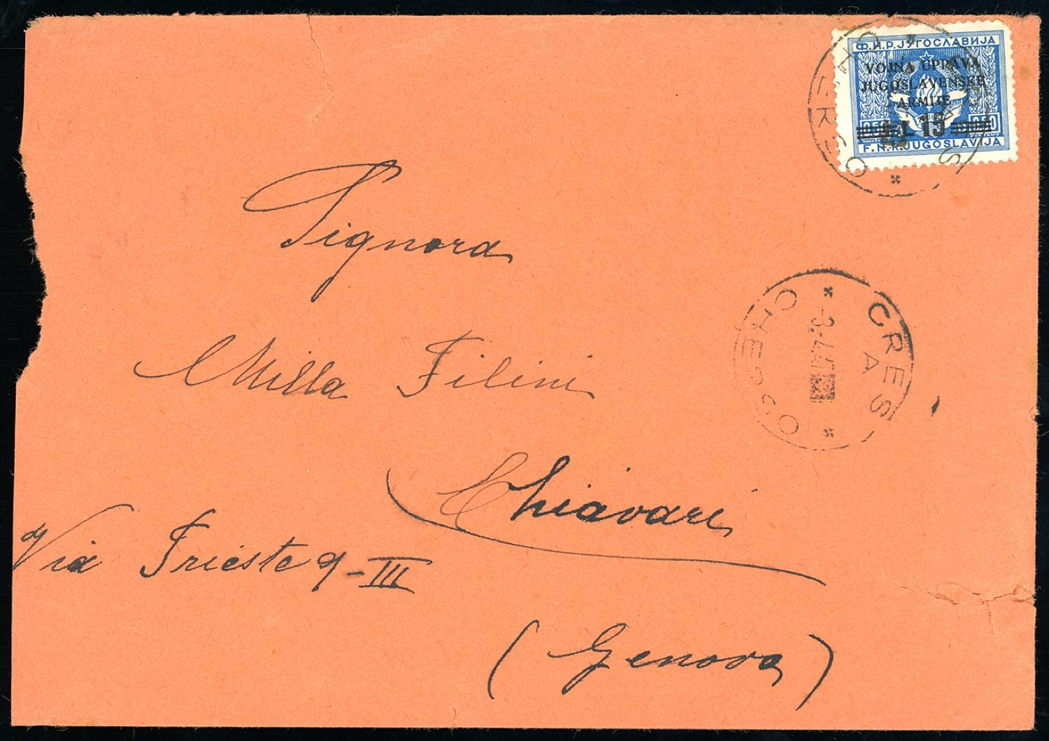 LITORALE SLOVENO AMMINISTRAZIONE MILITARE JUGOSLAVA 1947 - 15 lire su 0,50 d. (74), un angolo arrotondato, su busta da Cherso 3/4/1947 a ... Read more