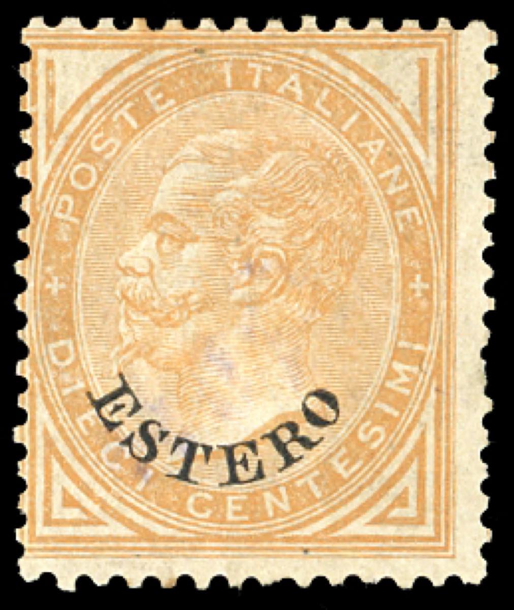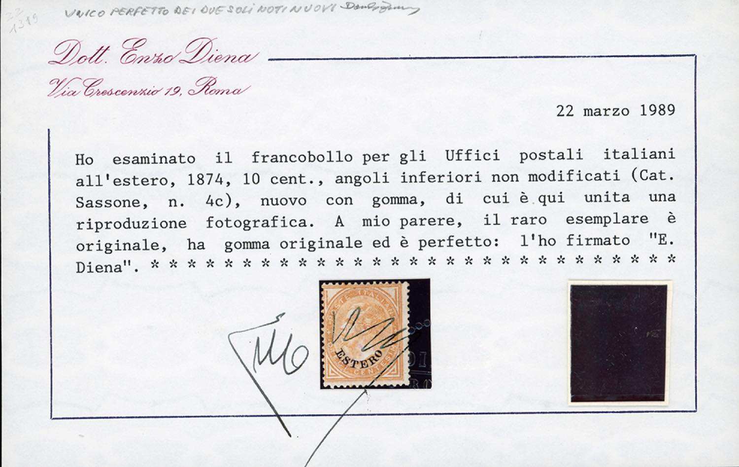 EMISSIONI GENERALI 1874 - 10 cent. De La Rue, soprastampato "ESTERO", angoli inferiori non modificati (4c), gomma originale, perfetto. Si tratta dell'UNICO ESEMPLARE NUOVO PERFETTO di questa rarissima varietà del quale si conoscono solo un altro esemplare nuovo, ma difettoso e quattro usati. GRANDE RARITA' DEL LEVANTE ITALIANO. Cert. Enzo Diena, con annotazione sull'unicità di Daniele Zanaria.