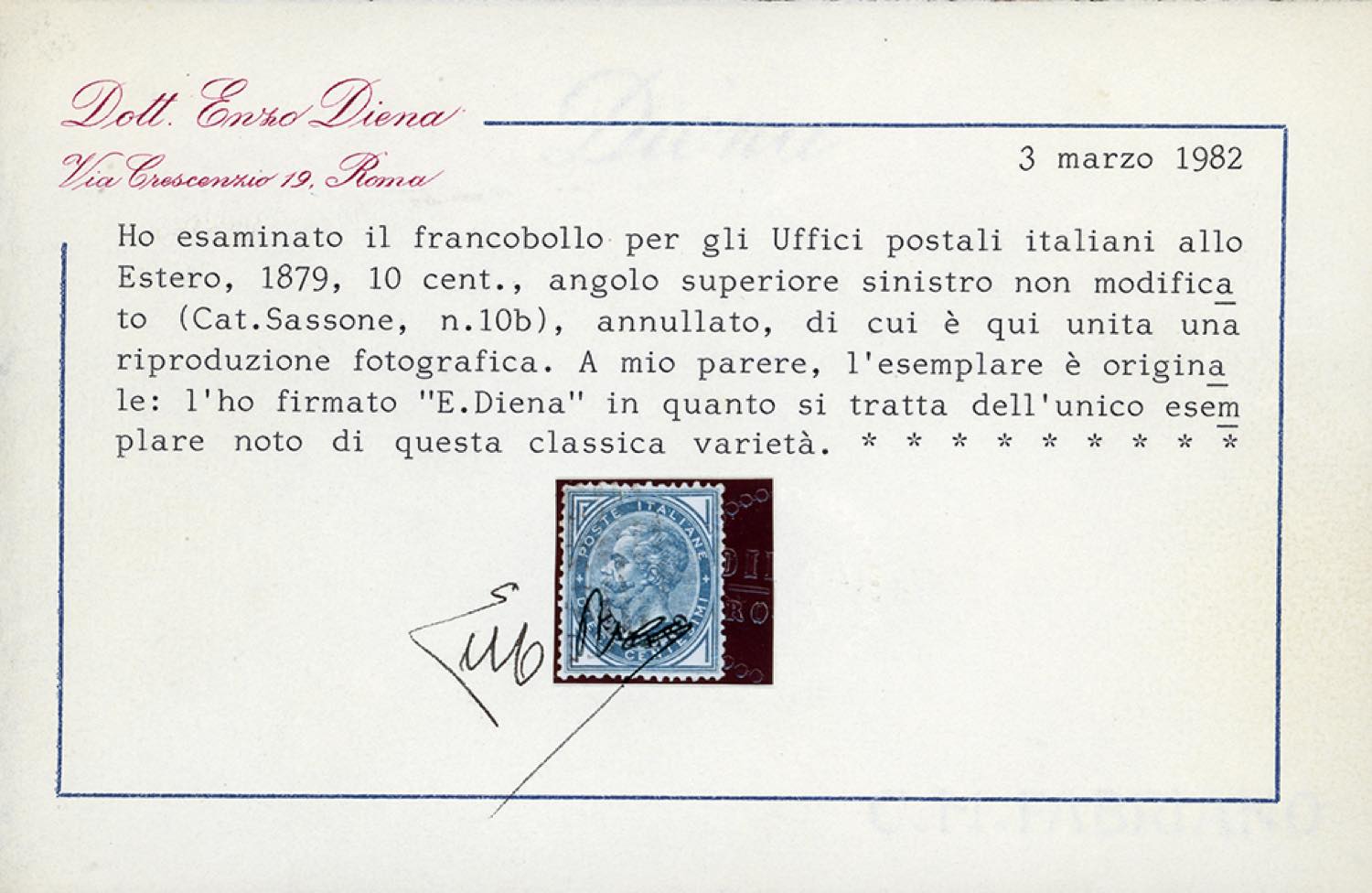 EMISSIONI GENERALI 1879 - 10 cent. azzurro, soprastampato "ESTERO", angolo superiore sinistro non modificato, pos. 16 (10b), usato, leggermente riparato. UNICO ESEMPLARE NOTO. Una delle massime rarità dei francobolli soprastampati "ESTERO". Cert. E.Diena.