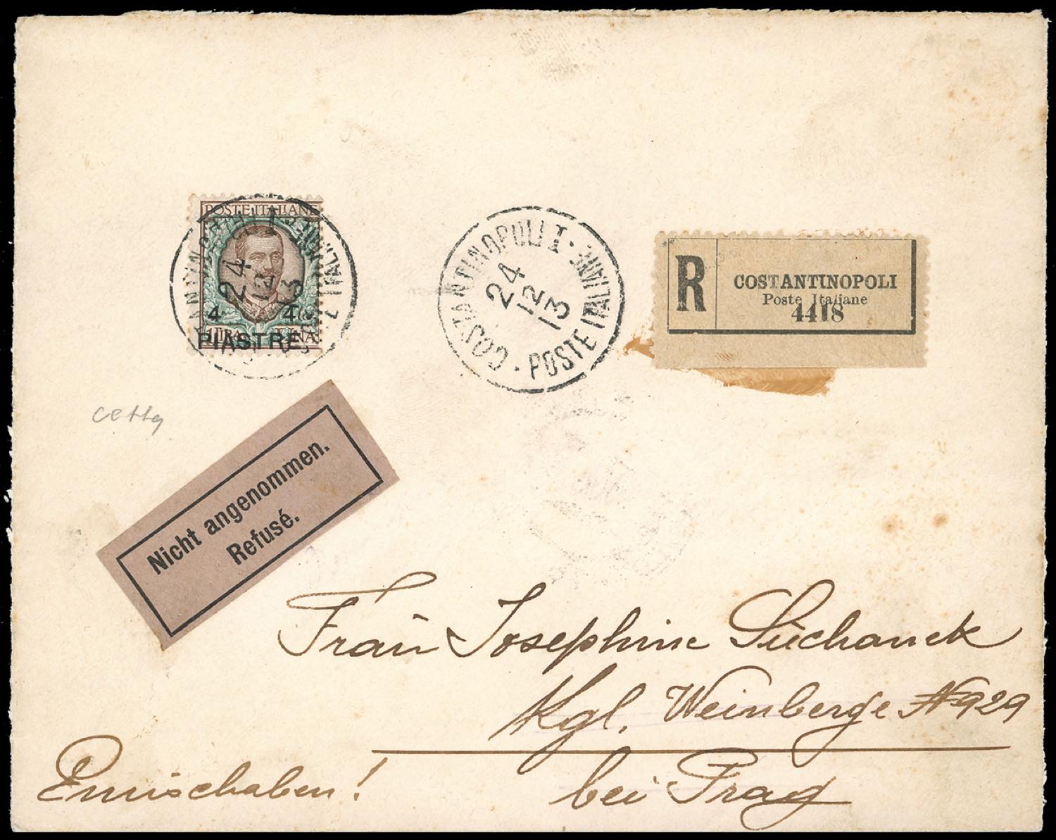 COSTANTINOPOLI 1913 - 4 pi. su 1 lira IV emissione locale (18), perfetto, isolato su busta raccomandata da Costantinopoli 24/12/1913 a Praga, bollo d'arrivo. Rara. Cert. Colla.