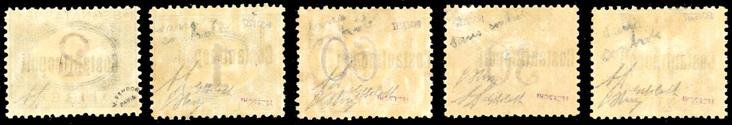 COSTANTINOPOLI SEGNATASSE 1922 - Serie completa soprastampata, senza il bollo postale di controllo (1a/5a), gomma originale, lieve traccia di linguella, perfetti. Rarissimo insieme, irripetibile per la presenza del valore da 2 lire che è l'UNICO NOTO. Uno dei pezzi "chiave" di tutto il Levante. Tutti firmati da noti periti, cert. G.Bolaffi e A.Diena per il 2 lire.