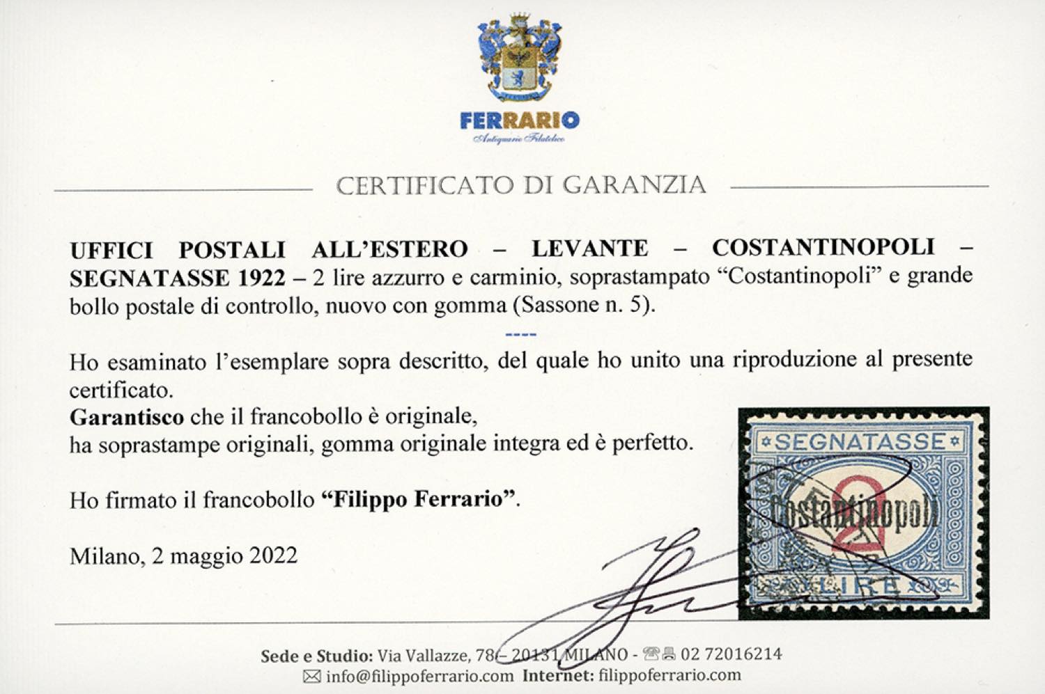 COSTANTINOPOLI SEGNATASSE 1922 - 2 lire (5), gomma originale integra, perfetto. A.Diena, cert. Ferrario.