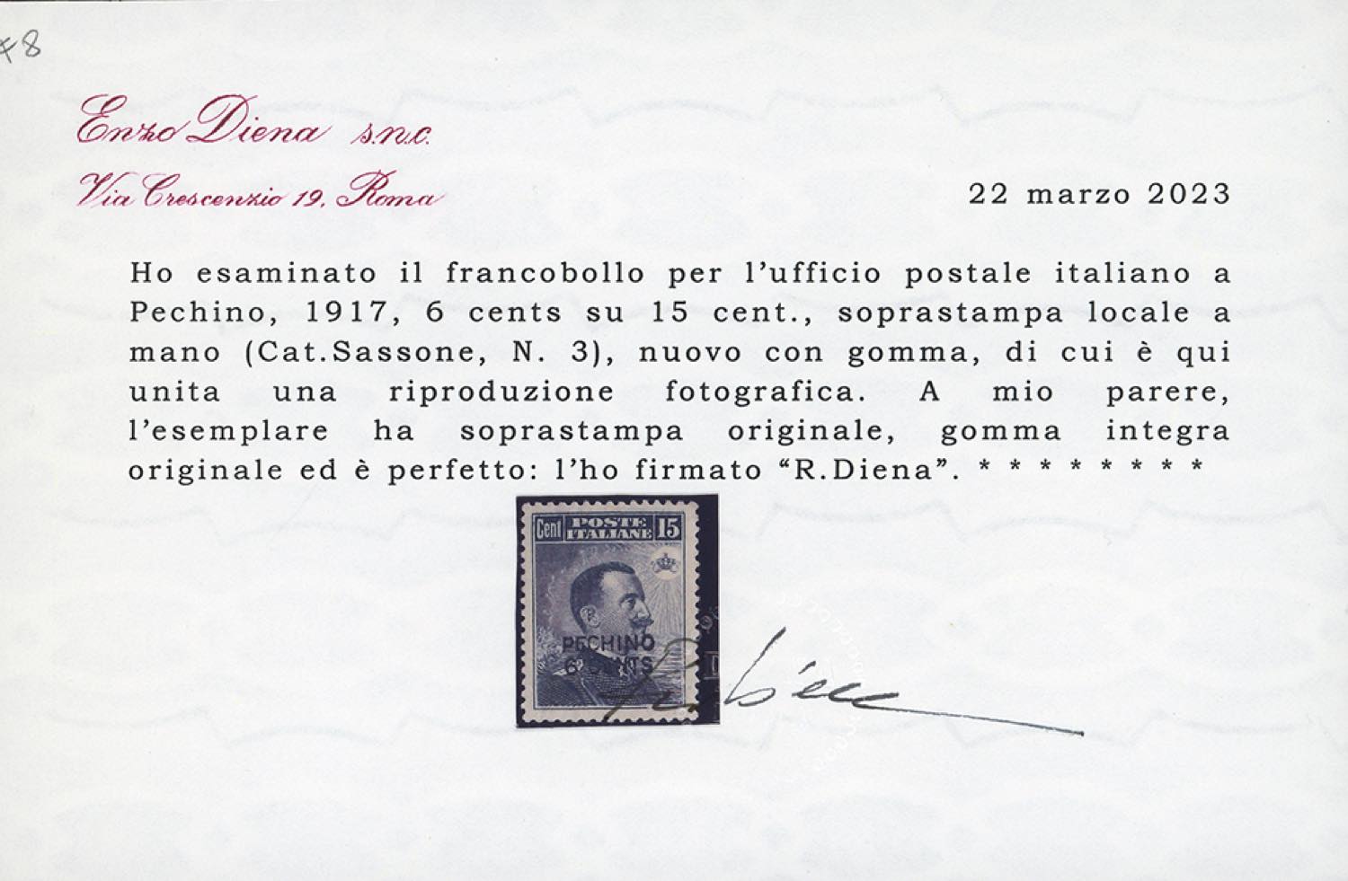 PECHINO 1917 - 6 cent. su 15 cent. soprastampato a mano (3), ben centrato, gomma originale integra, perfetto. Fiecchi, Ferrario, cert. Diena.