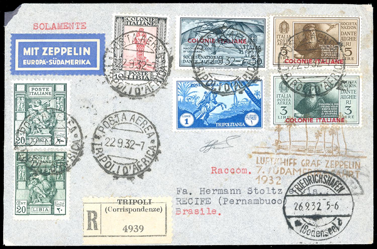 POSTA AEREA 1932 - 50 cent, 3 lire e 5 lire Dante (A8,A10,A11), con complementari tra cui i gemelli del 20 cent. Sibilla Libica dent. 14 e dent. 11 (Libia 40,54), perfetti, su aerogramma raccomandato da Tripoli 22/9/1932 per il Brasile, trasportato con la VII Crociera Zeppelin in Sudamerica, bollo speciale del volo. Ferrario.