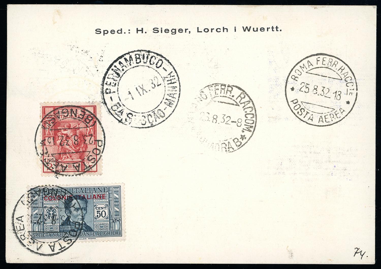 POSTA AEREA 1932 - 50 cent. al verso, 75 cent., 1,75 lire, 3 lire Dante (16,17,19,A10), con complementari, perfetti, su cartolina via ... Read more