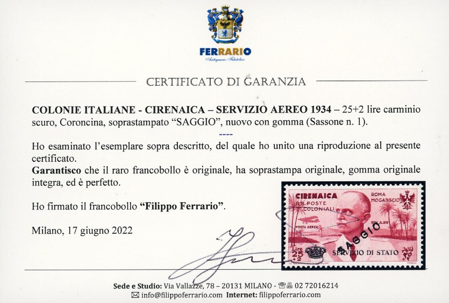 SERVIZIO AEREO 1934 - 25 + 2 lire carminio scuro, Coroncina, soprastampato "SAGGIO" (1), nuovo, gomma originale integra, perfetto. ... Read more