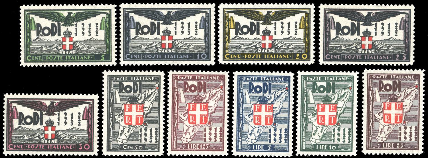 1932 - Ventennale occupazione Egeo, serie completa (65/74), gomma originale integra, perfetti, ottima qualità. Alti valori Ferrario.