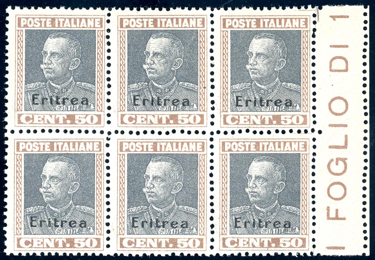 1928 - 50 cent. Parmeggiani (128), blocco di sei, bordo di foglio, gomma originale integra, perfetto.