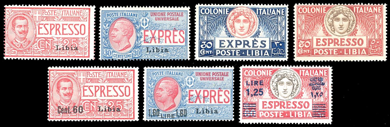 LIBIA ESPRESSI 1915/36 - Le prime tre emissioni e 1,25 lire su 60 cent. dent. 14 (1/2,3/4,5/6,17), gomma originale integra, perfetti. Ottima qualità.