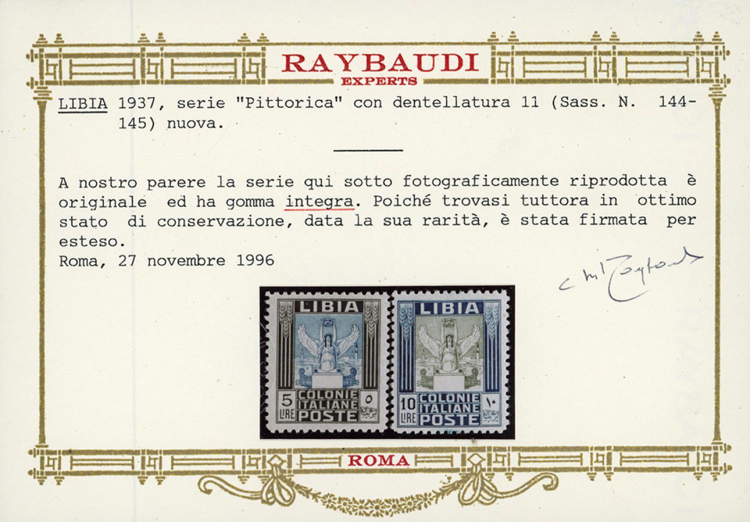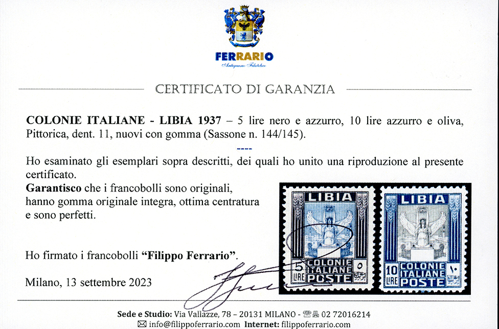 1937 - 5 lire e 10 lire Pittorica, dent. 11 (144/145), ottima centratura, gomma originale integra, perfetti. Splendidi e rari di questa qualità. A.Diena, cert. Oro Raybaudi e Ferrario.
