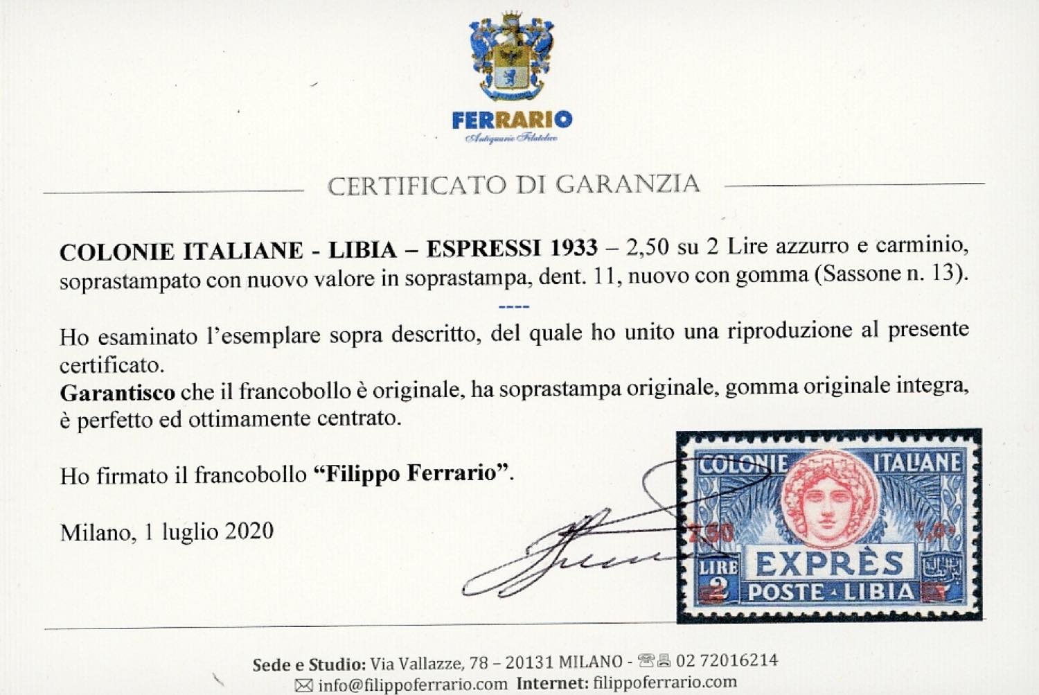 ESPRESSI 1933 - 2,50 su 2 lire azzurro e carminio, soprastampato (13), nuovo, gomma originale integra, perfetto e ottimamente centrato. ... Read more
