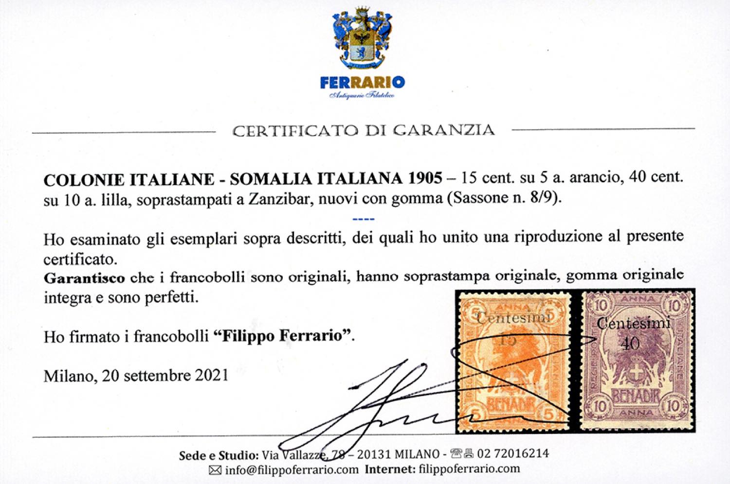 1905 - Soprastampati di Zanzibar, serie completa (8/9), gomma originale integra, perfetti. A.Diena e cert. E.Diena per il n. 8, cert. ... Read more