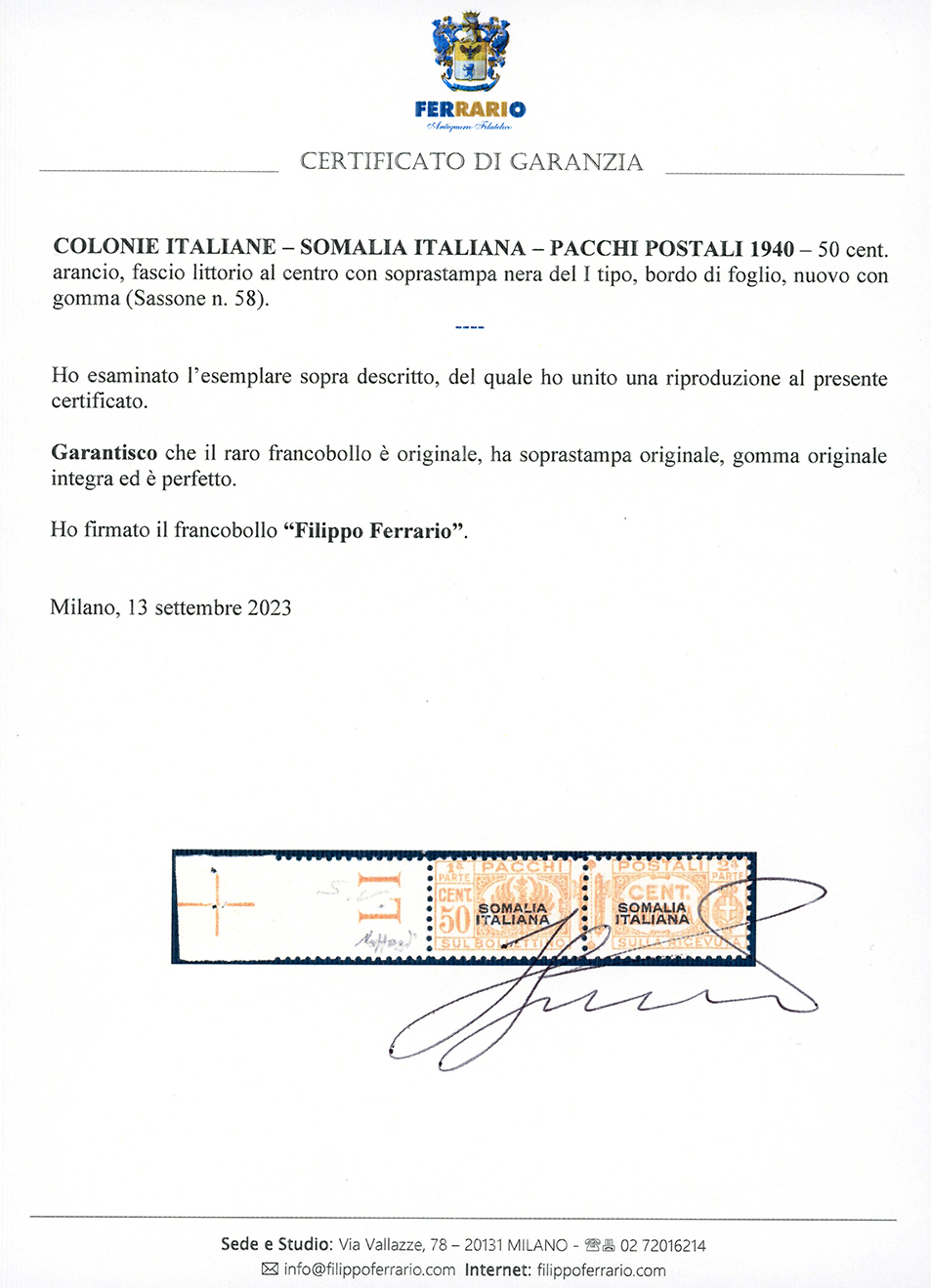 PACCHI POSTALI 1940 - 50 cent. soprastampato, I tipo (58), bordo di foglio, gomma originale integra, perfetto e molto fresco, Raro e di ottima qualità. Caffaz, cert. Oro Raybaudi e Ferrario.