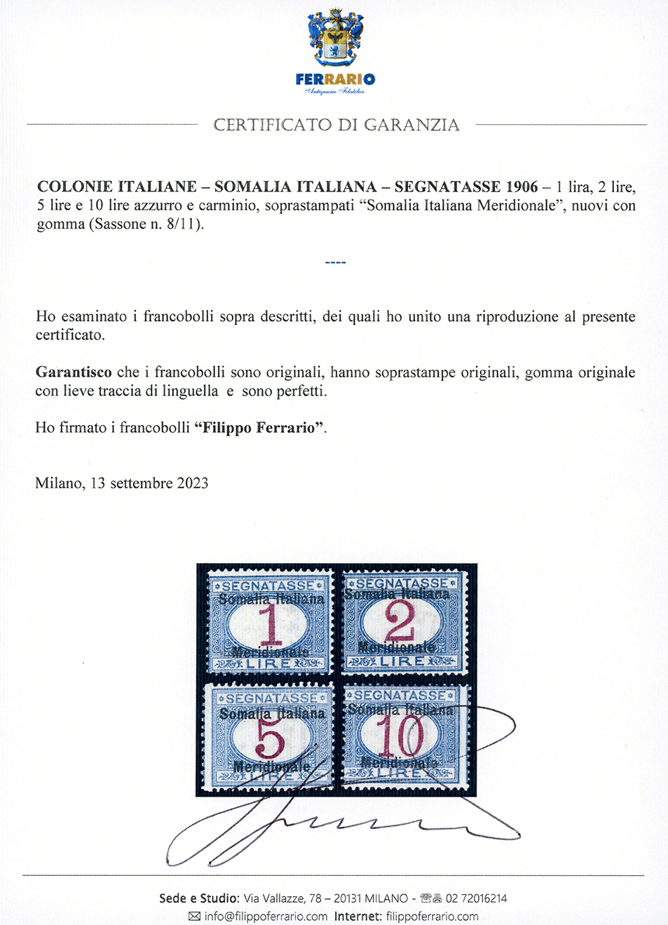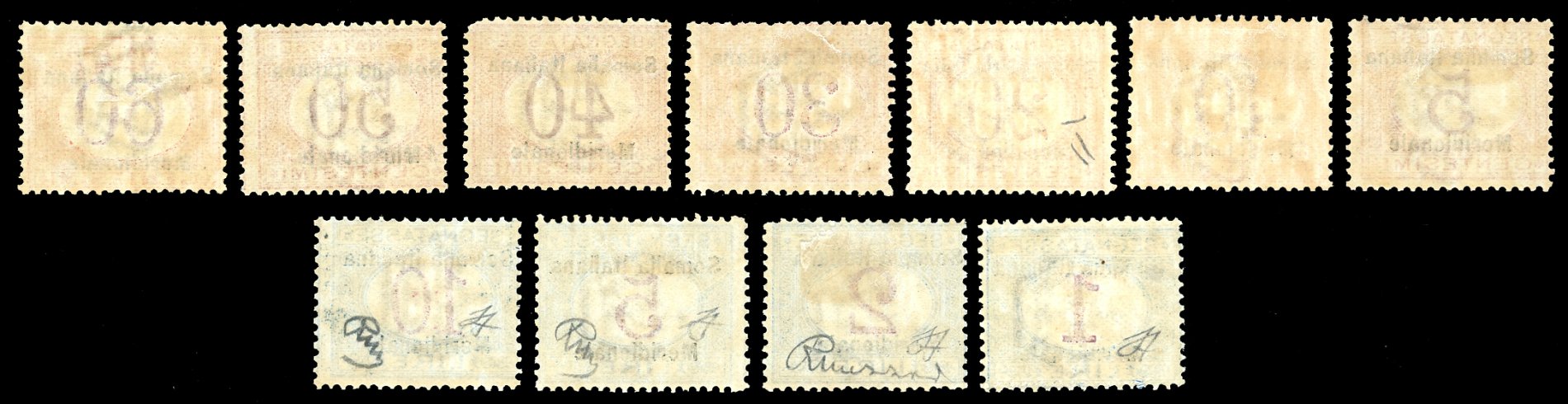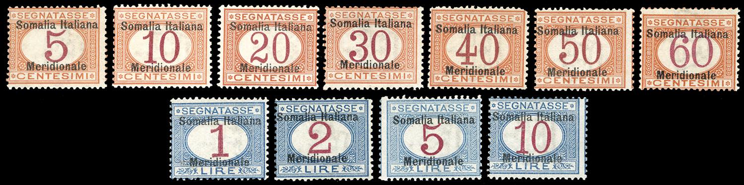 SEGNATASSE 1906 - Somalia Italiana Meridionale, serie completa (1/11), gomma originale, perfetti, lieve traccia di linguella. Alti valori Mezzadri, cert. Ferrario.