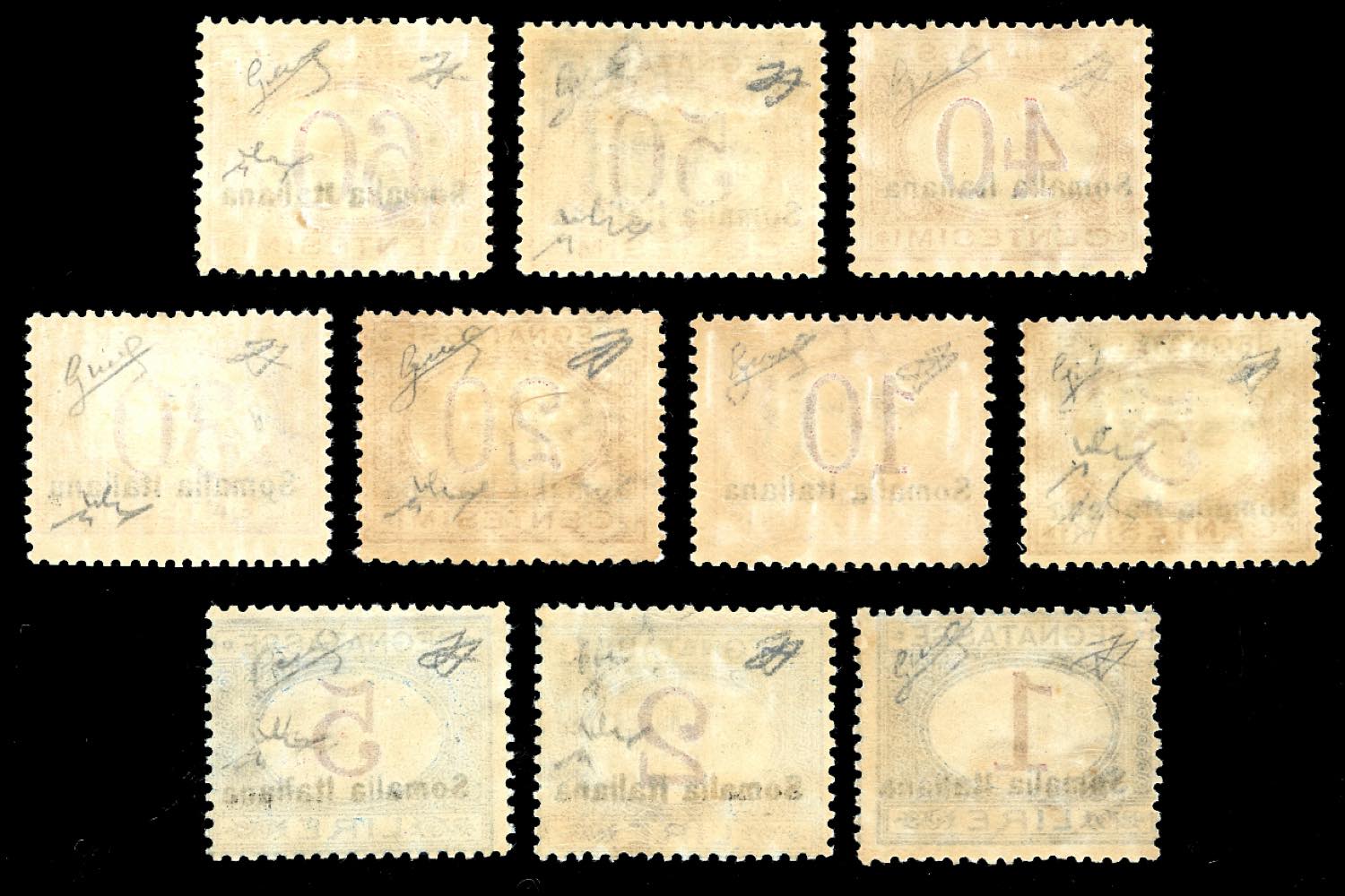 SEGNATASSE 1920 - Soprastampati in basso, serie completa (23/32), gomma originale integra, perfetti. Chiavarello per alcuni valori, cert. Ferrario per la serie.