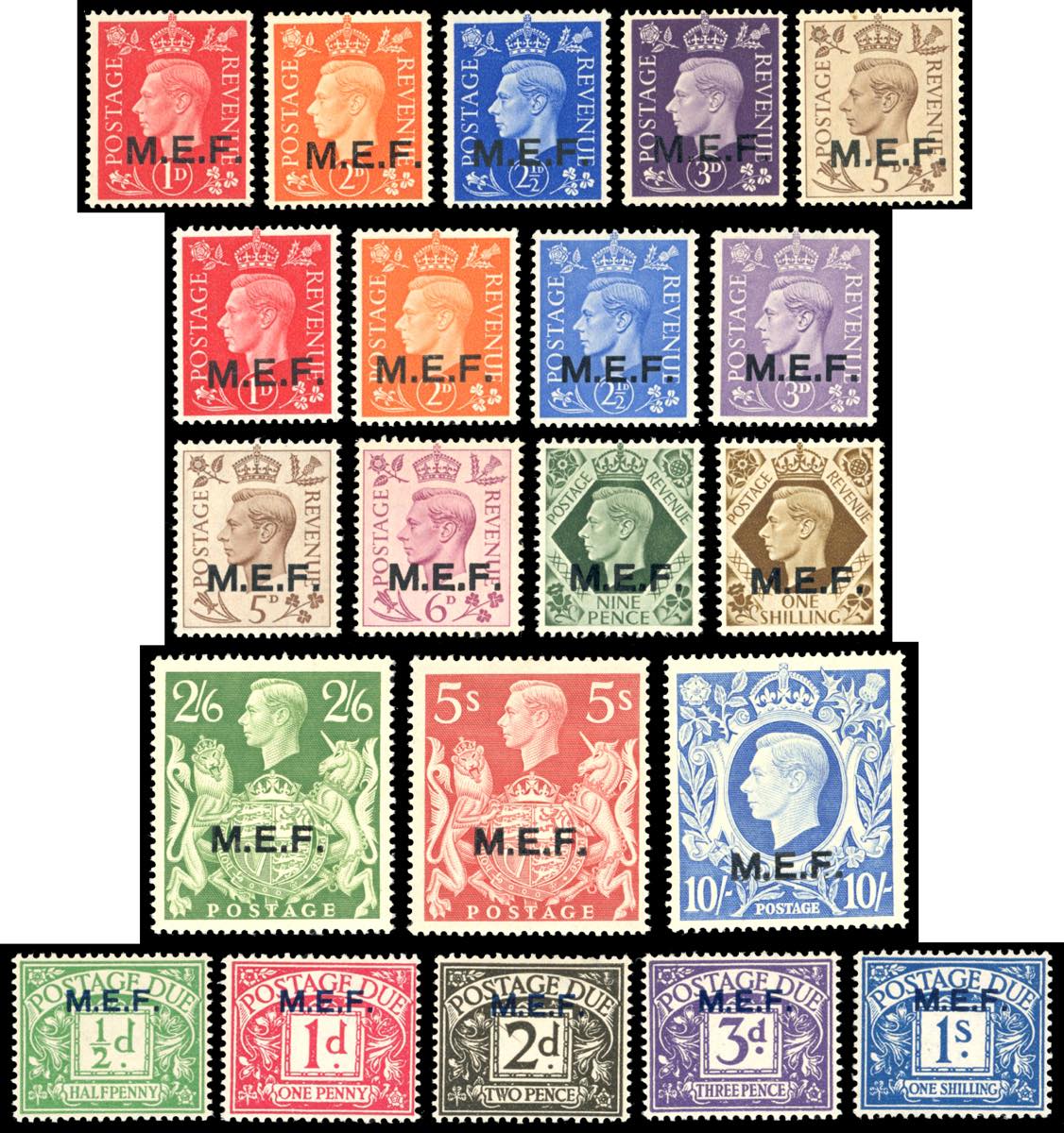 OCCUPAZIONE BRITANNICA M.E.F. 1942/47 - I francobolli e i servizi soprastampati emessi (1/16+T), gomma originale integra, perfetti.