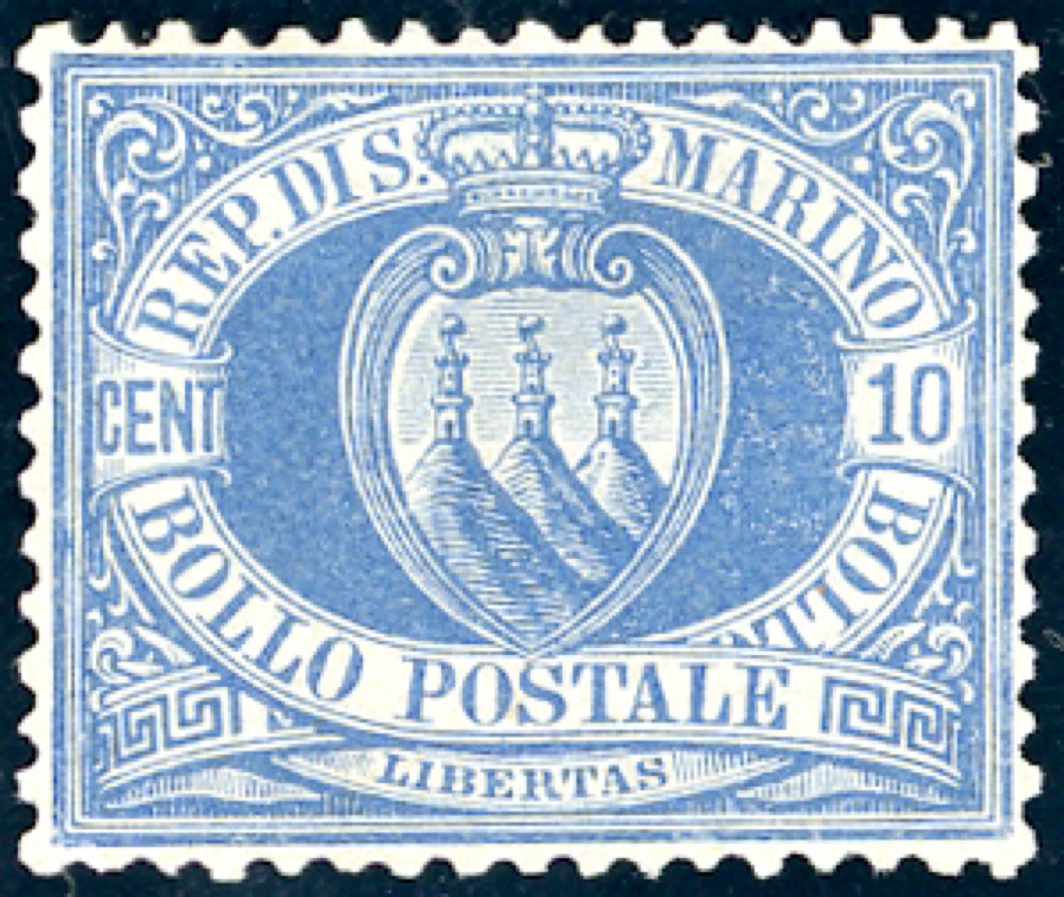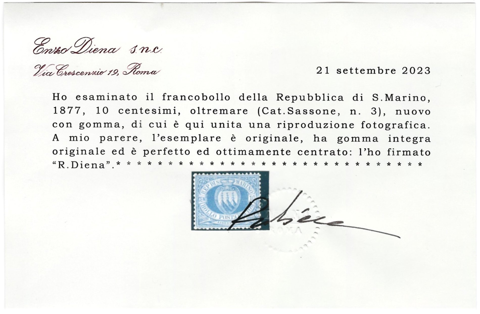 1877 - 10 cent. oltremare Stemma (3), ottima centratura, gomma originale integra, perfetto e molto fresco. Splendido e molto raro in queste condizioni. Cert. Diena.