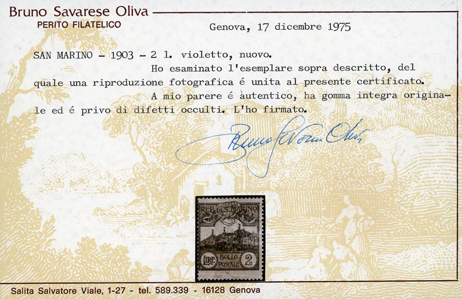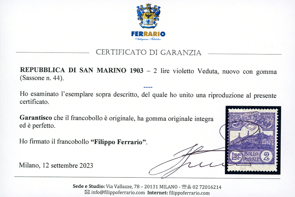 1903 - 2 lire Veduta (44), gomma originale integra, perfetto, molto fresco. Cert. Ferrario.