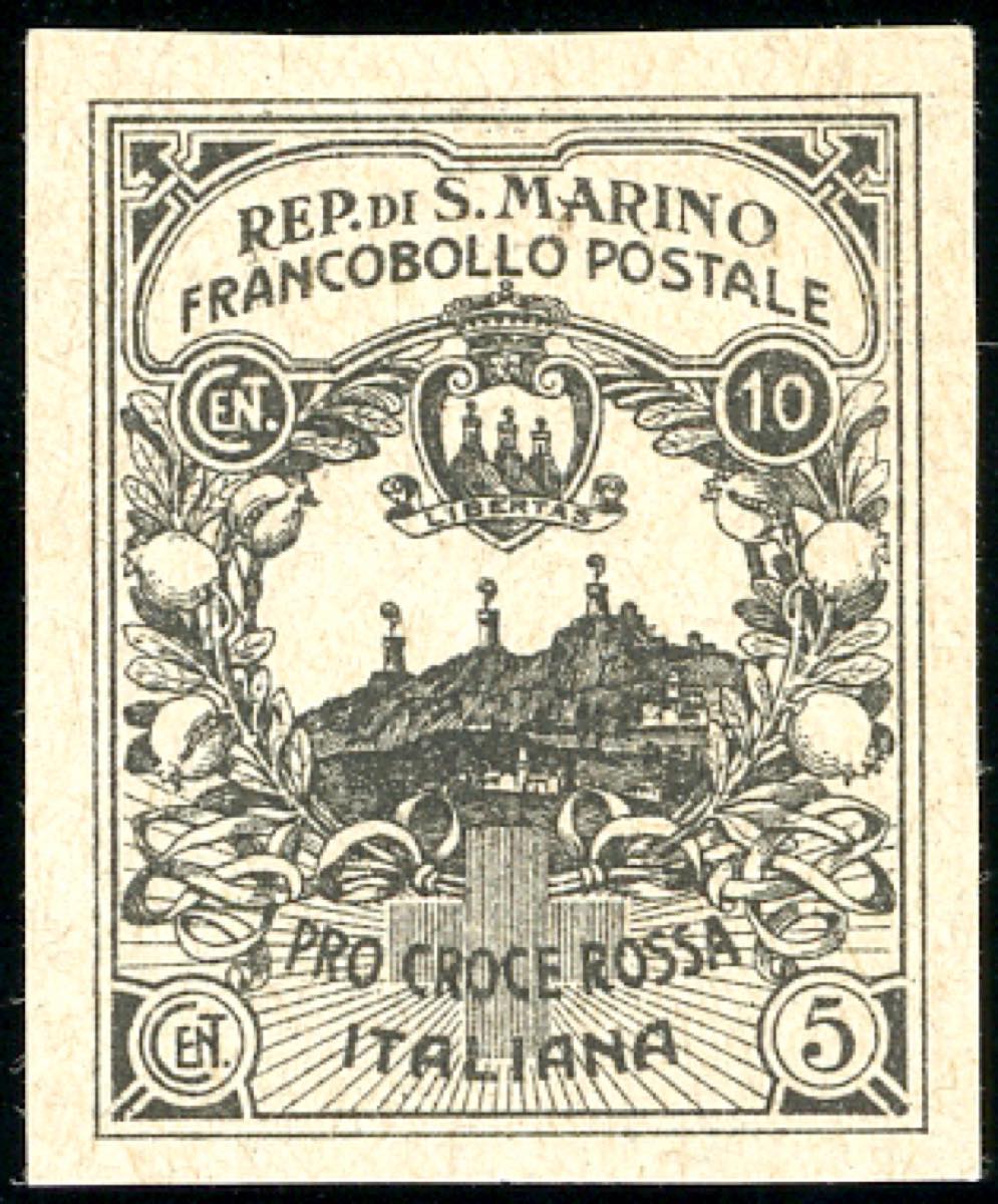 1916 - 10 + 5 cent. Croce Rossa, prova in nero del francobollo non adottato (CEI P50A), senza gomma come sempre, perfetta. Rara. Cert. ... Read more