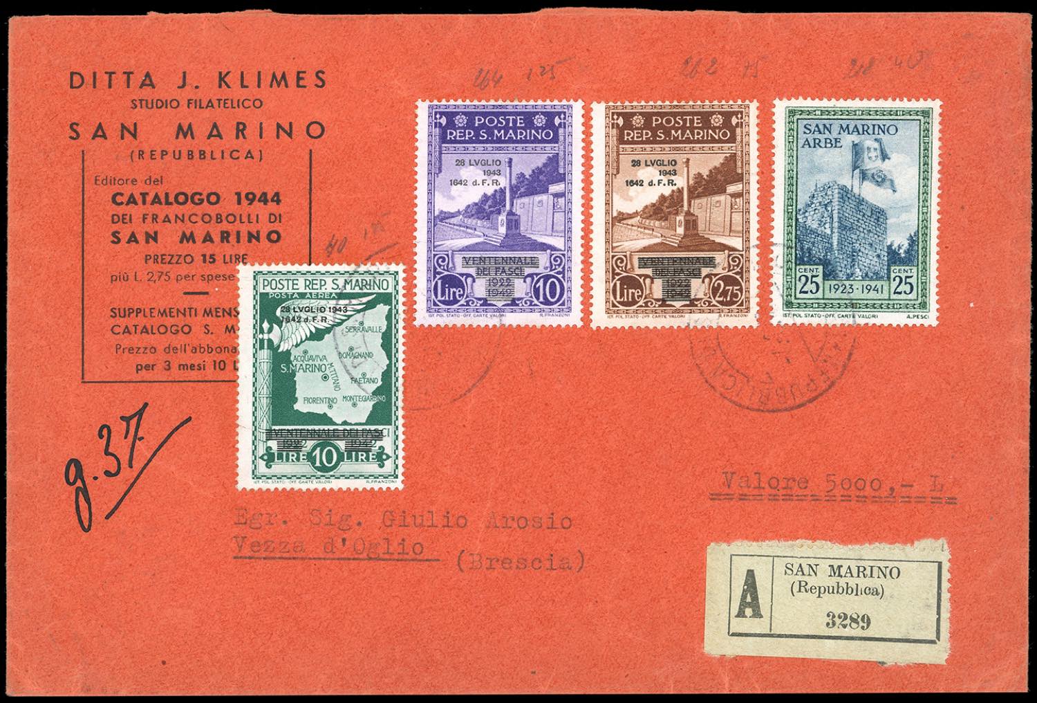 1943 - 2,75 lire, 10 lire, posta aerea Ventennale dei fasci soprastampati, 25 cent. Arbe (262,264,A40,218), perfetti, su busta assicurata da San Marino a Brescia. Non comune assicurata per la Repubblica Sociale Italiana.