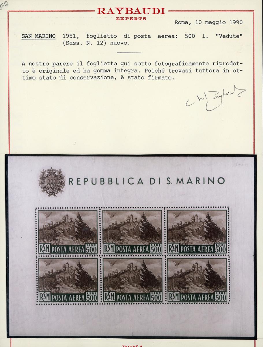 1951 - 500 lire Veduta, foglietto (12), gomma originale integra, perfetto. Ottima qualità. Cert. Raybaudi.