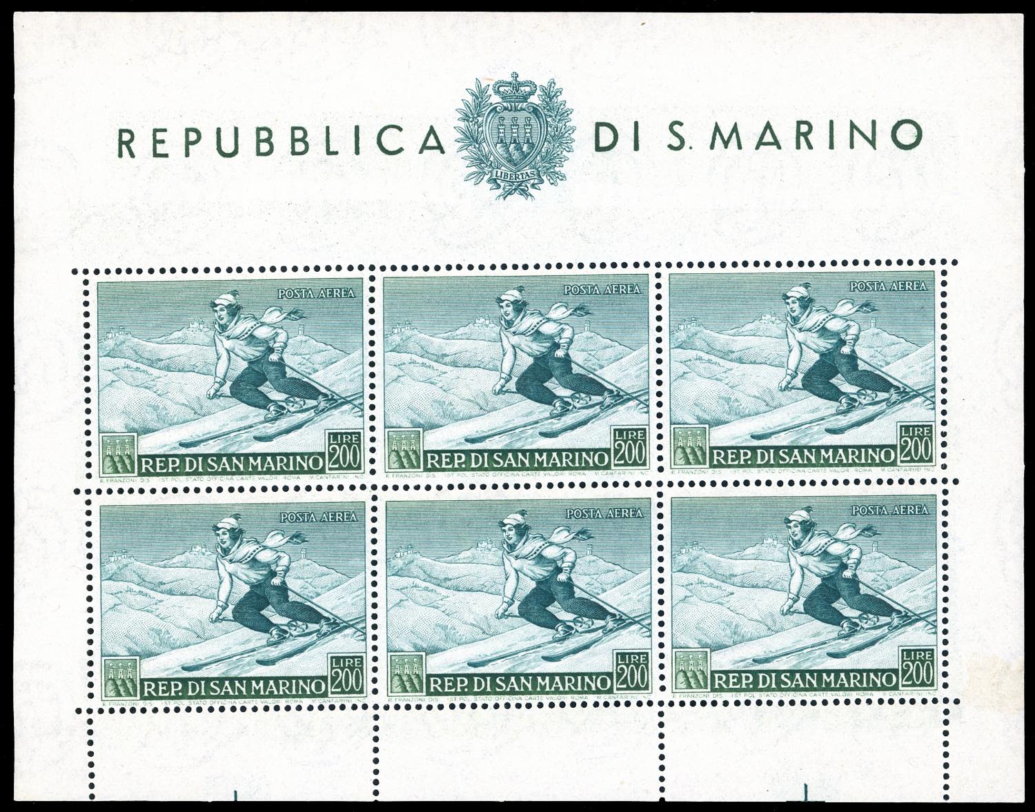 Lot 2155 - 1953 - 200 lire Sciatrice, foglietto (15), gomma originale ...