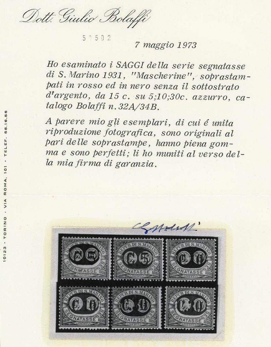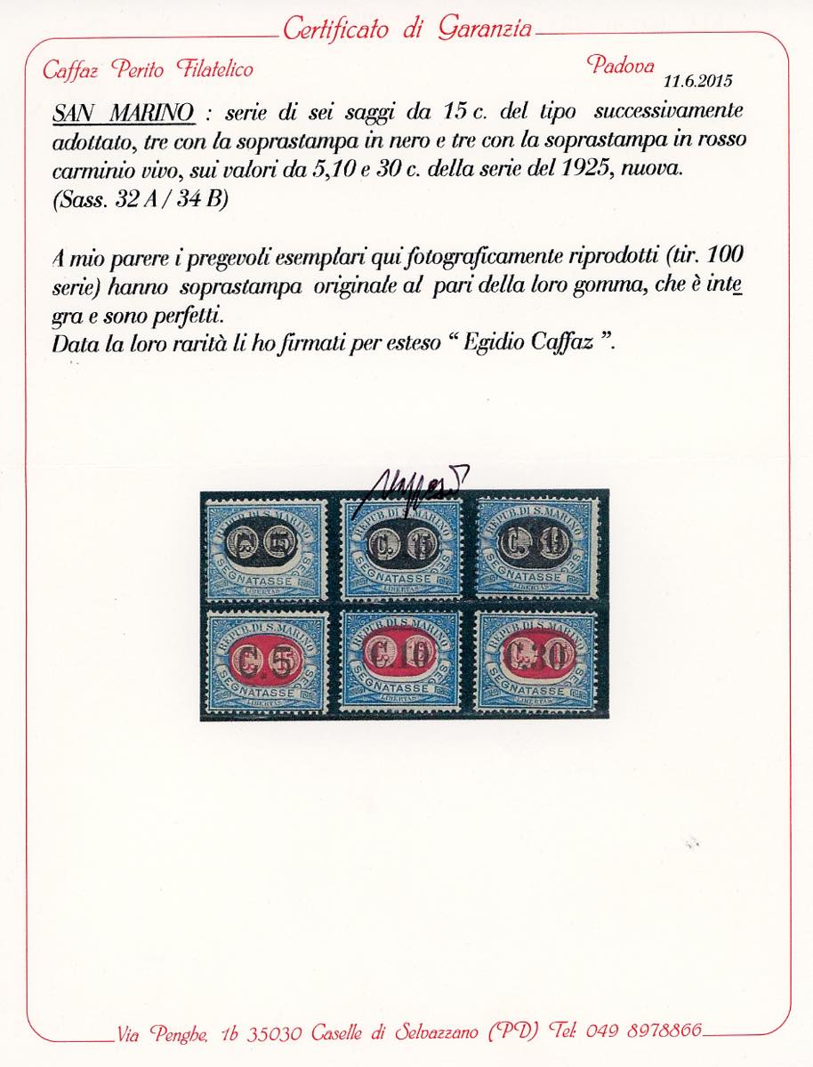 1931 - "Mascherine" soprastampa di saggio non adottata, serie completa di 6 valori non emessi (32A/34A,32B/34B), gomma originale integra, perfetti e molto freschi.Tiratura 100 serie, rarità. Cert. G.Bolaffi e Caffaz.