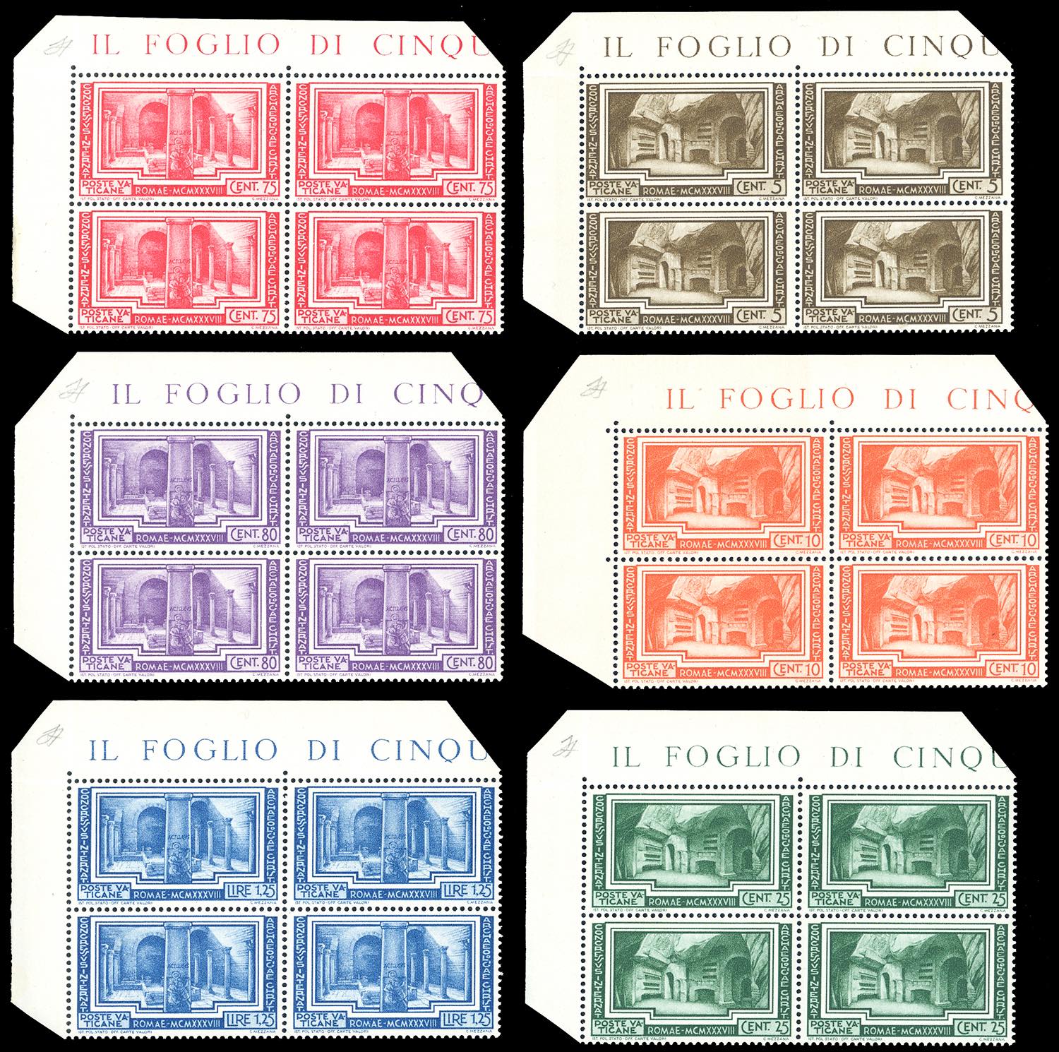 1938 - Archeologia, serie completa (55/60), blocchi di quattro, angolo di foglio, gomma originale integra, perfetti. Bellissimi. Ferrario.