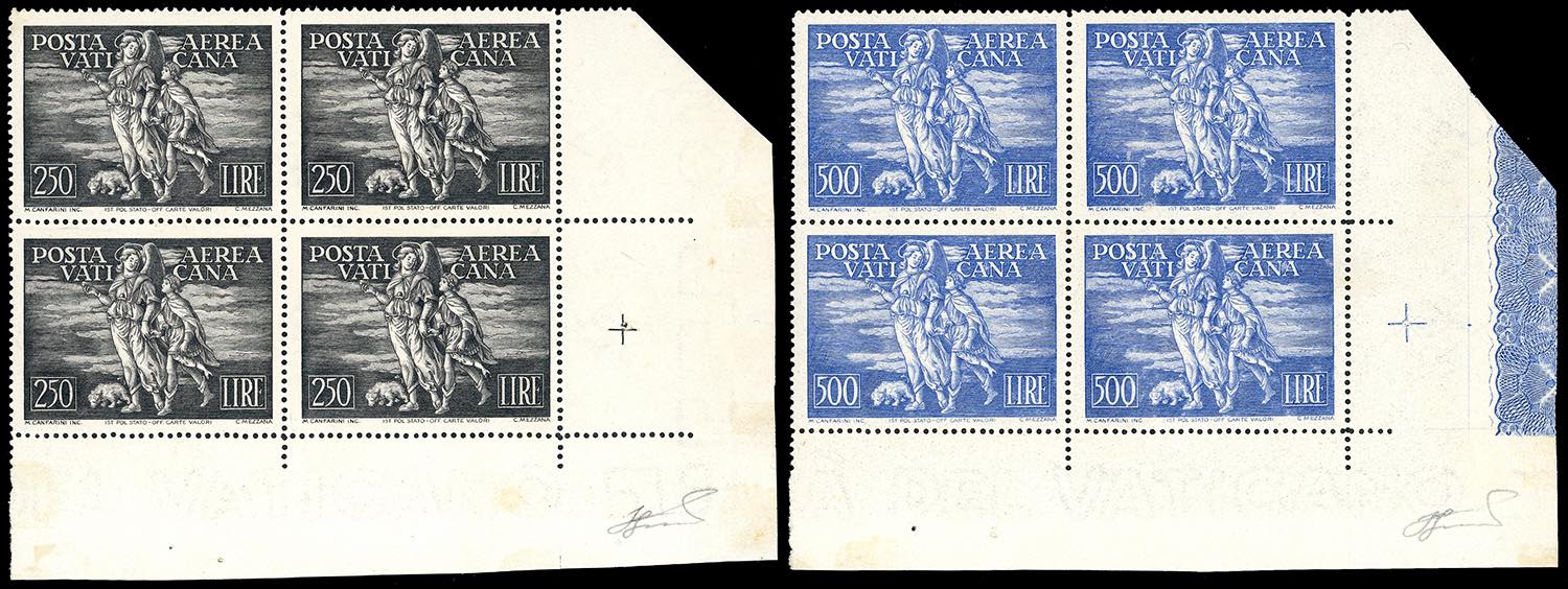 1948 - Tobia, serie completa in blocchi di quattro angolo di foglio (16/17), nuovi, gomma originale integra, perfetti e ben centrati. Bellissimi. Cert. Ferrario.