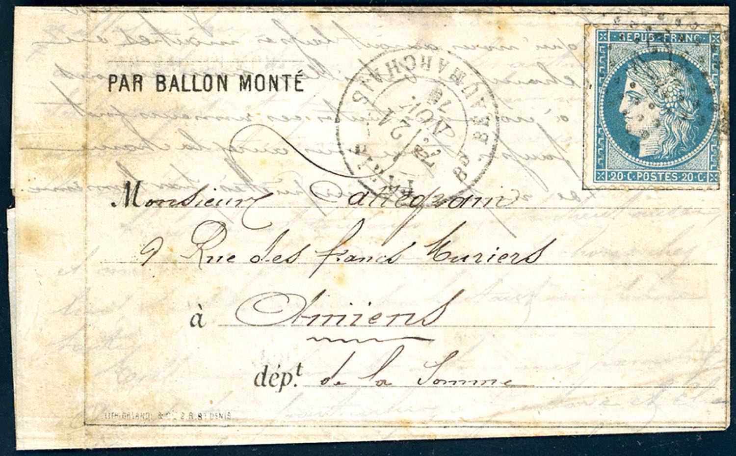 FRANCIA POSTA AEREA BALLON MONTE' 1870 - 20 cent. Ceres (37), perfetto, su aerogramma Lettre Formule Orlandi da Parigi 21/11/1870 ad Amiens, probabilmente trasportato con il Ballon Montè "La Ville D'Orleans", senza bollo d'arrivo.