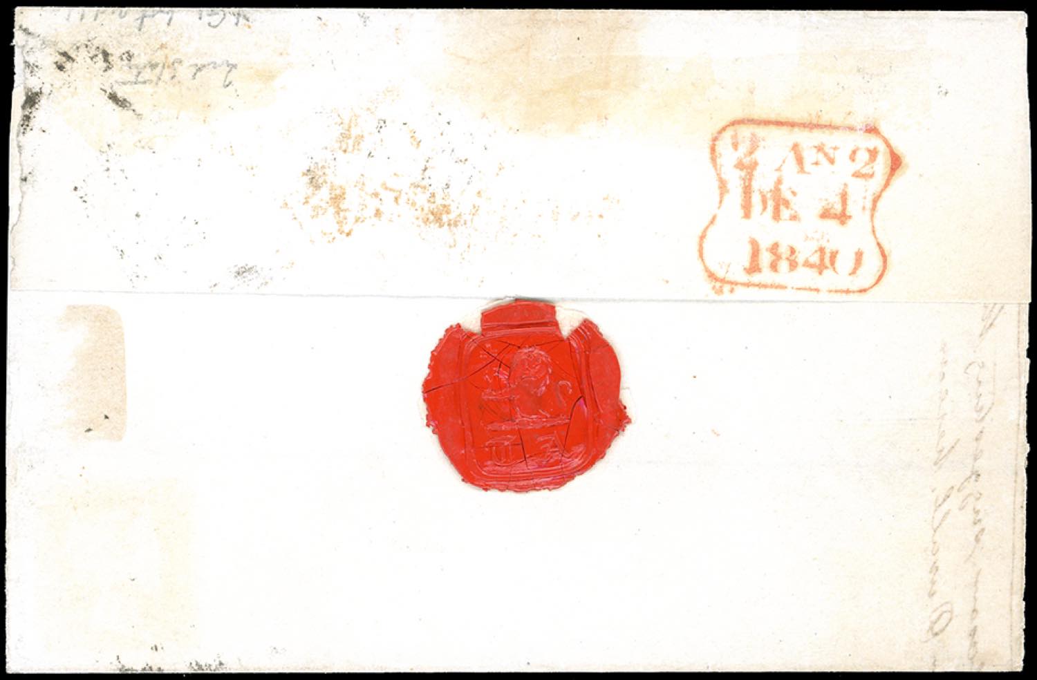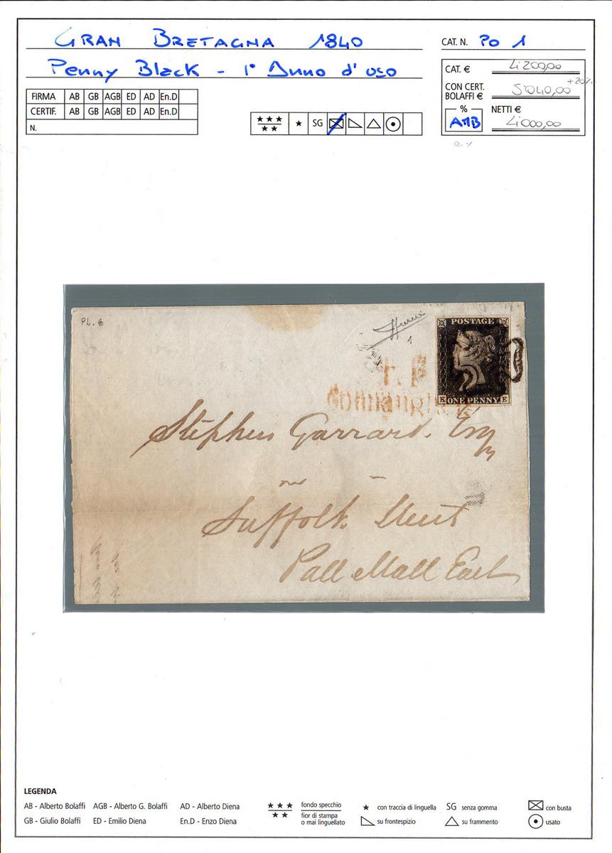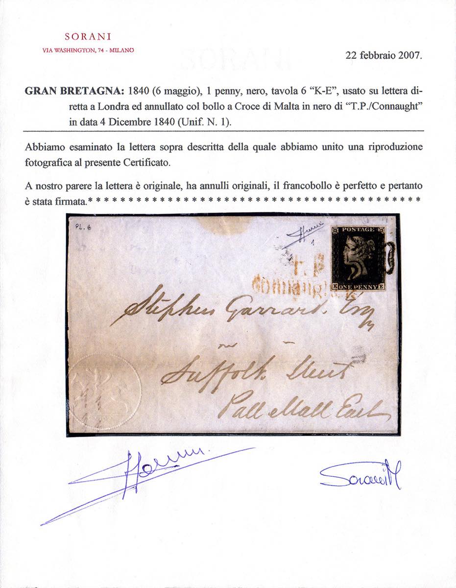 GRAN BRETAGNA 1840 - 1 p. Penny Black (1), tavola 6, lettere K-E, perfetto e ben marginato, annullato con bollo a croce di Malta in nero e lineare su due righe TP CONNAUGHT per Londra, bollo di arrivo al verso del 4/12/1840. Pregevole uso nel primo anno d'uso. Cert. Sorani.