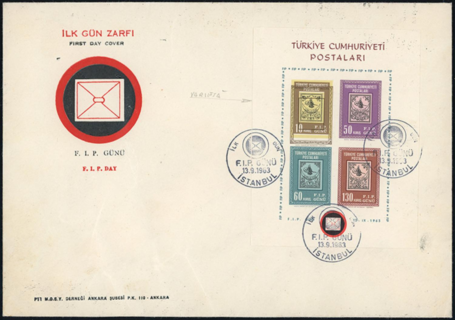 TURCHIA FOGLIETTI 1963 - Giornata FIP, foglietto (BF11), varietà stampa del nero spostato in basso sul n. 1671A, usato su busta FDC. Allegato confronto.