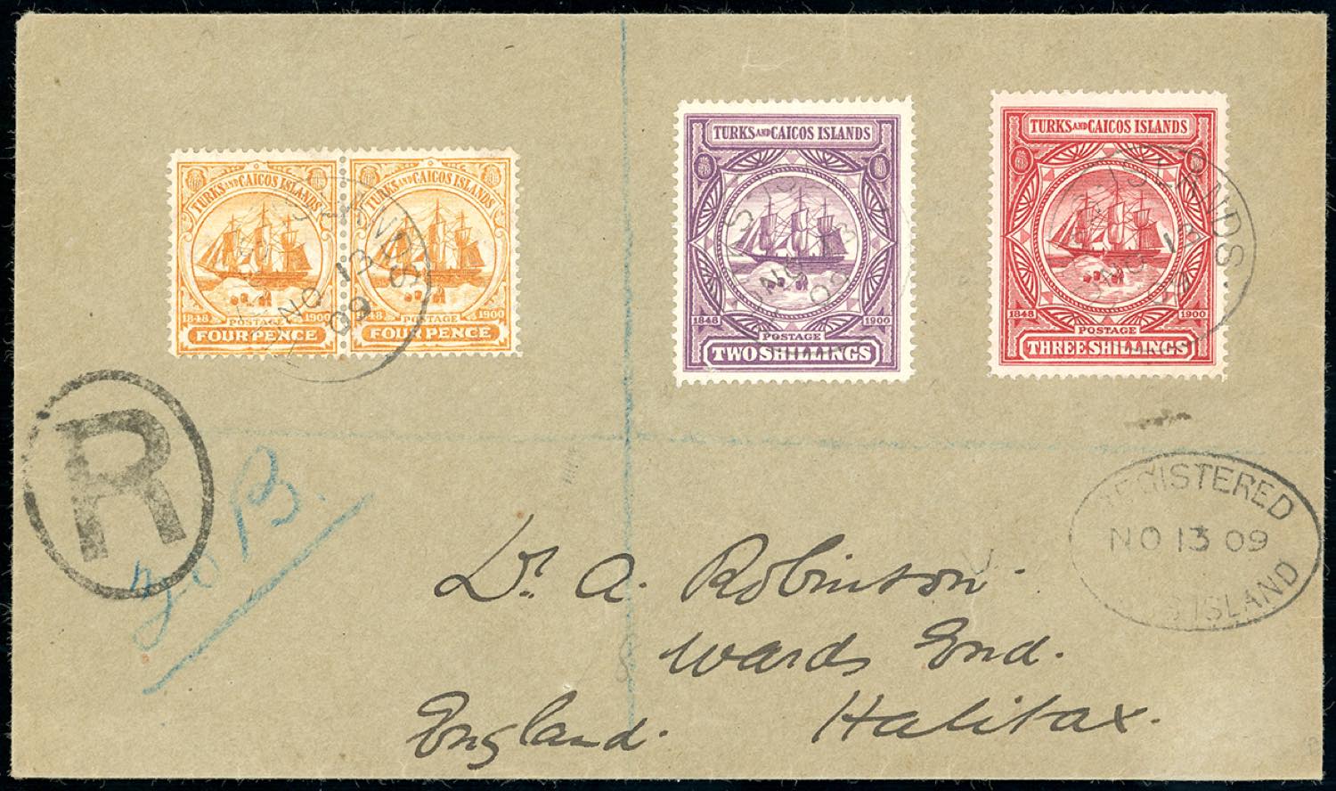 BRITISH COLONIES -TURKS E CAICOS 1909 - Busta raccomandata affrancata con 4 p., coppia, 2 e 3 s. (Yv.38,41,42), perfetti, da TURKS ISLAND 13/11/1909 ad Halifax. Molto bella e rara.