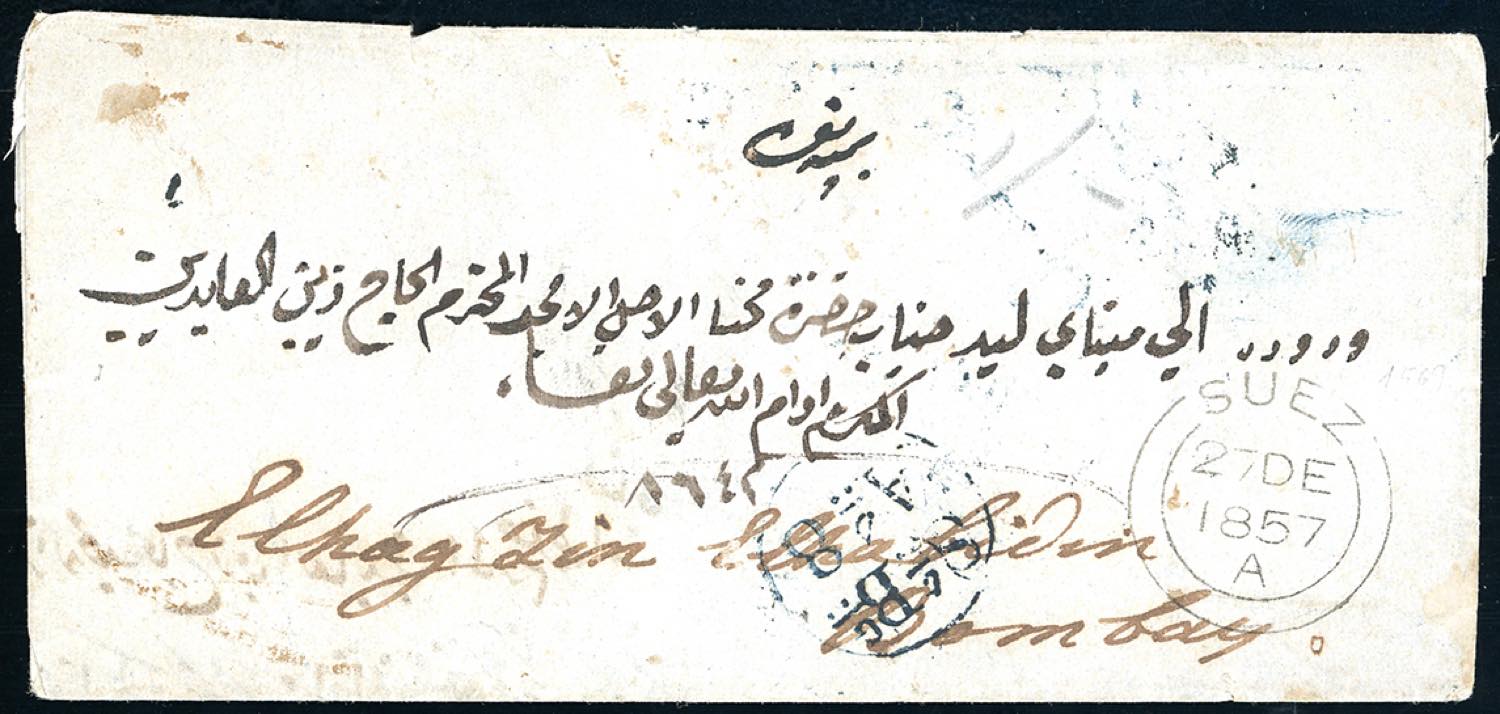 EGITTO 1857 - Busta non affrancata, con indirizzo bilingue in arabo e inglese, da Suez 27/12/1857 a Bombay in India, arrivata il 24/1/1858. ... Read more