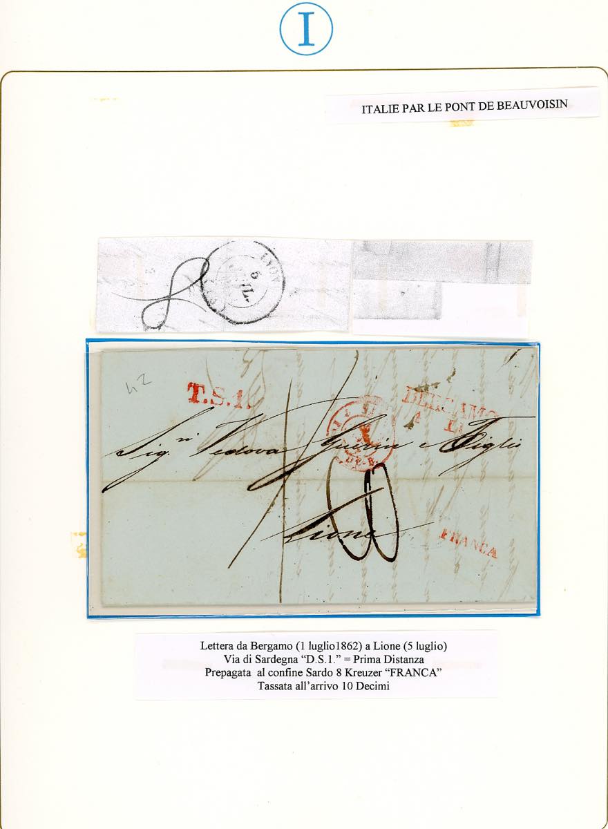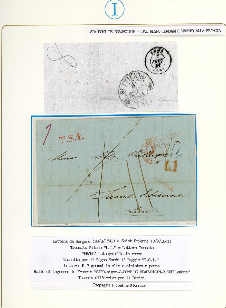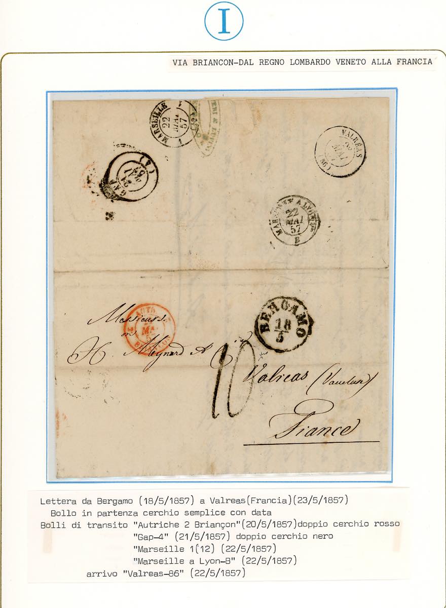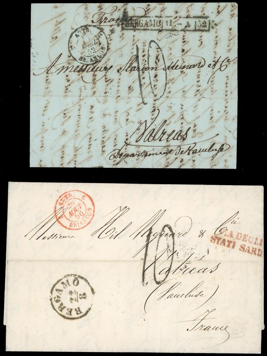 LOMBARDO VENETO PREFILATELICHE 1841/1862 - Bell'insieme di 9 lettere del periodo prefilateliche e non affrancate da Bergamo alla Francia, con ottima varietà di bolli. Sono quasi tutte montate in fogli da esposizione con dettagliate descrizioni. Molto interessanti e provenienti dalla collezione Imperato.
