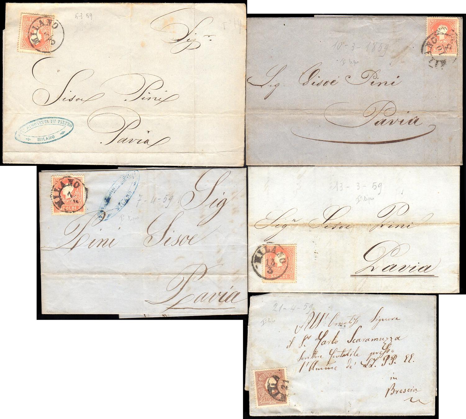 LOMBARDO VENETO 1858/1859 - Sette lettere affrancate con 5 soldi e quattro lettere con 10 soldi, tutti del I tipo (25,26), ottima qualità.