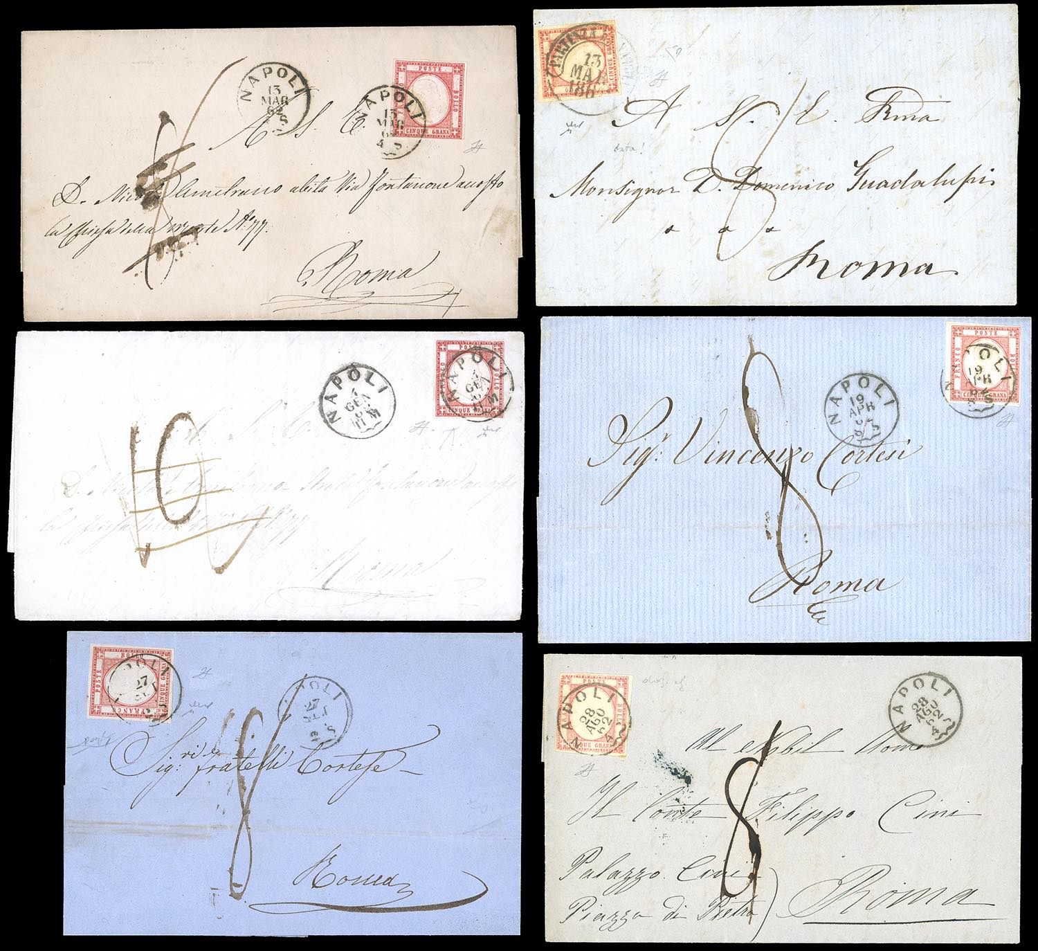 PROVINCE NAPOLETANE 1861/62 - Sei lettere affrancate con 5 grana, differenti colori, tutte indirizzate nello Stato Pontificio, due con le tassazioni in arrivo cassate. Interessanti. Tutte firmate da noti periti. Ex coll. Imperato.